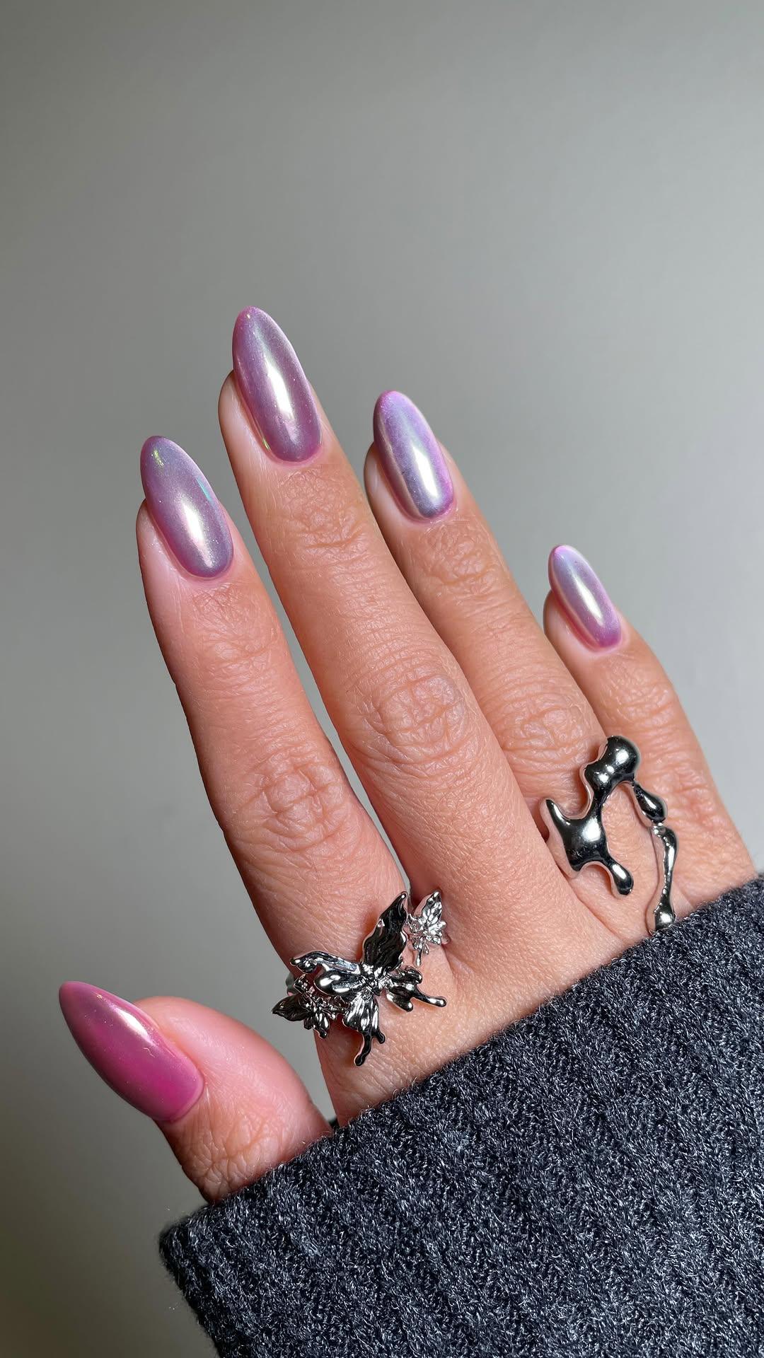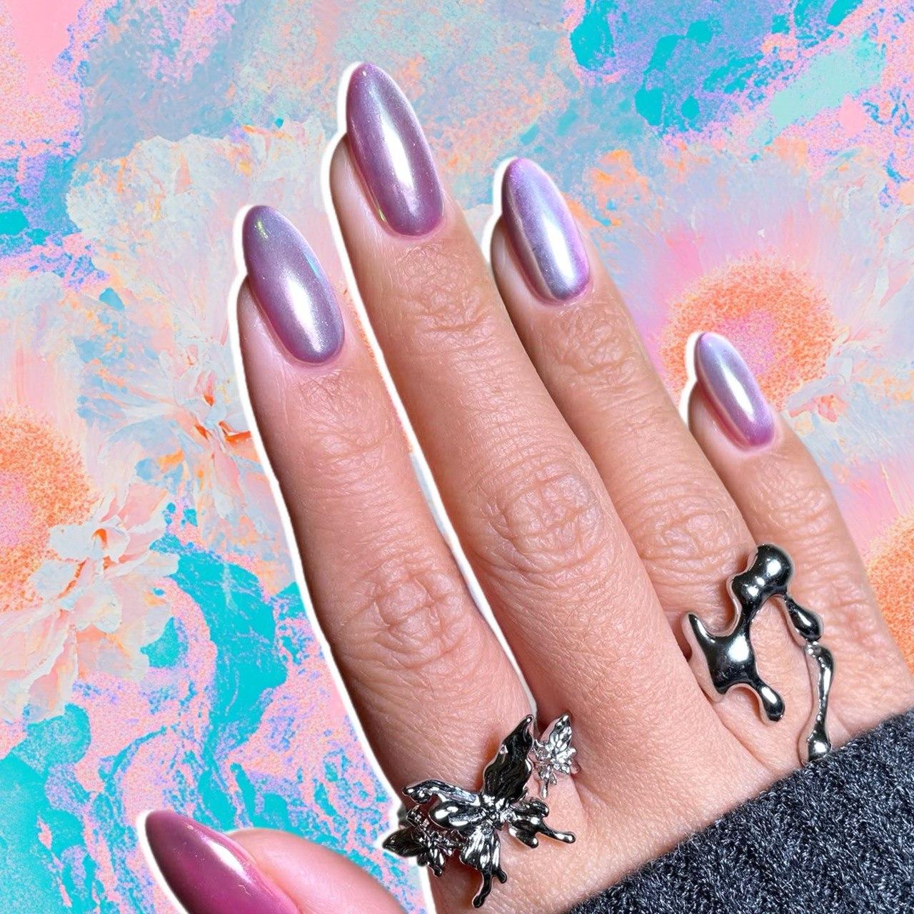 Он одновременно дерзкий, романтичный, футуристичный и немного в духе нулевых. И да, он выглядит так, будто ты поймала закат в ладошку. Секрет красоты дизайна — в многослойности. Этот маникюр — тщательно выстроенная композиция из трех шагов: неоновая база, серебряный магнитный лак и жемчужное сияние сверху. Звучит сложно? Но повторить дизайн вполне возможно.