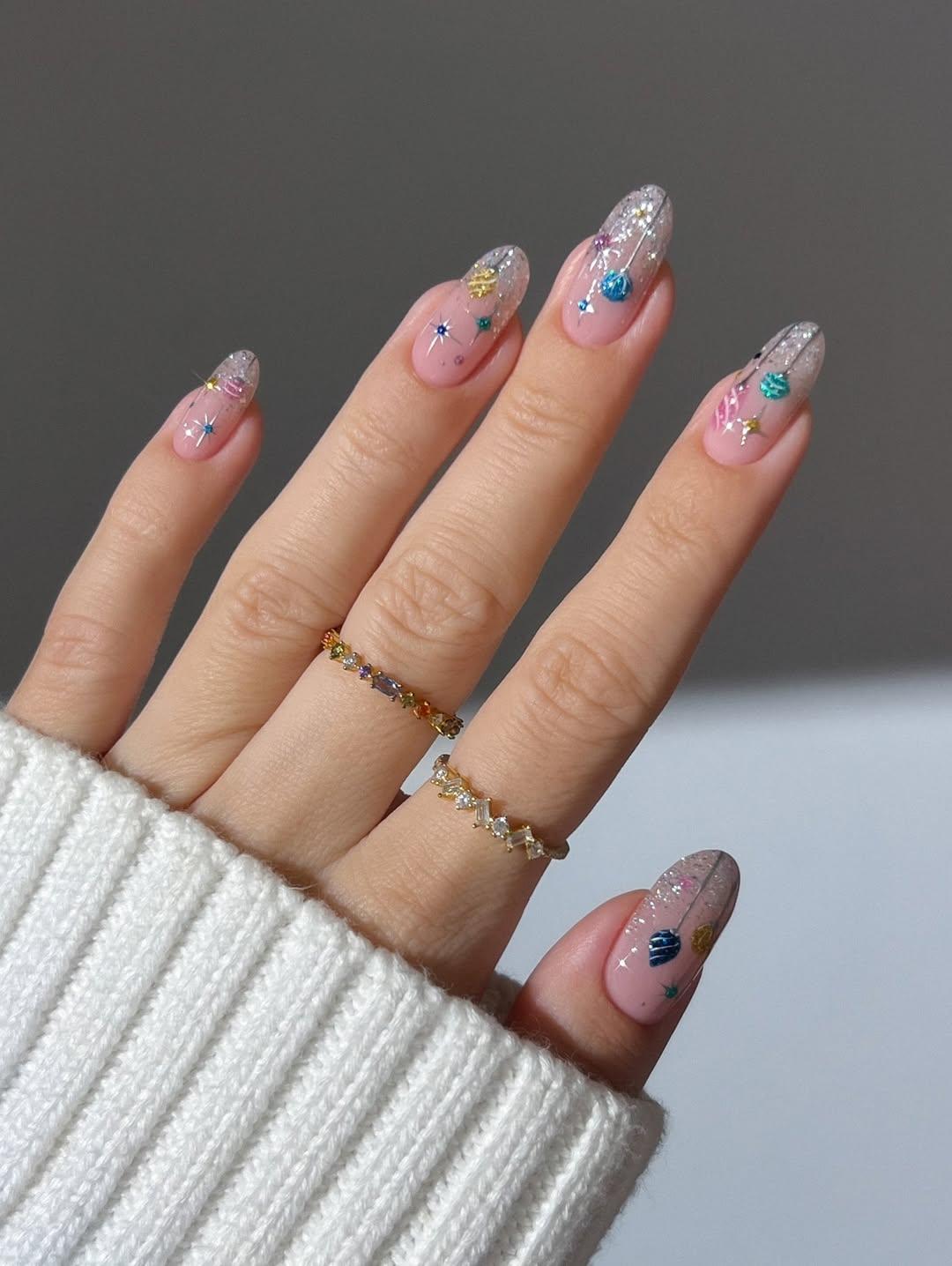 Если же хочется сделать красивый и современный маникюр, который бы поднимал настроение, то рисуй на ногтях разноцветные игрушки. А вот основой для дизайна выбирай красивый градиентный френч в серебре. Такой нейл-арт станет изящным вариантом как в преддверии Нового года, так и в саму праздничную ночь.