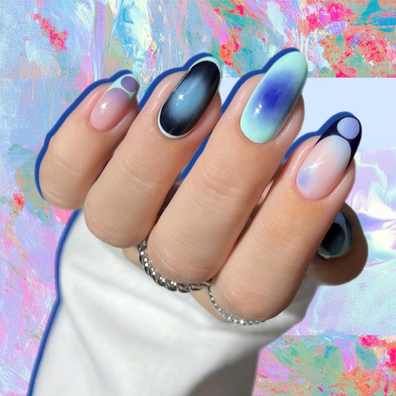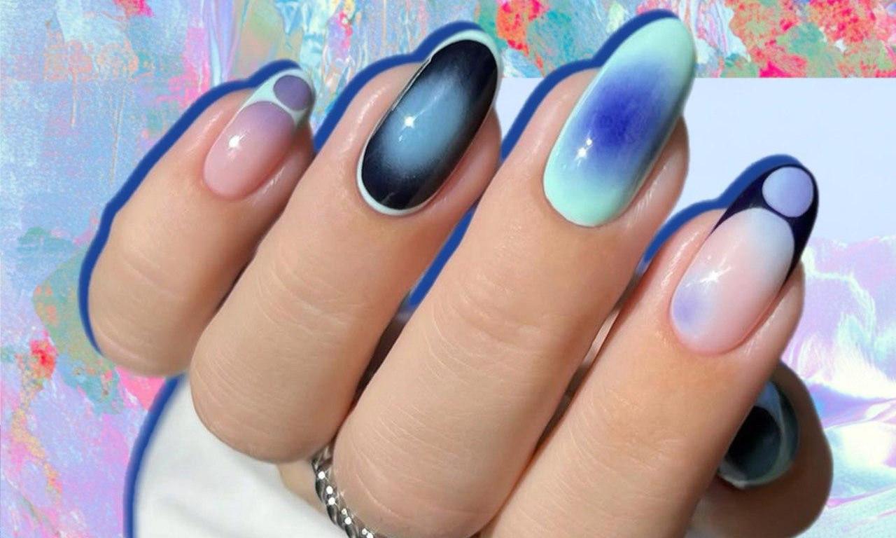 На другом ноготке ауру можно разместить не в середине, а сразу в двух местах — у кутикулы и кончика. Используй сразу два цвета — голубой и фиолетовый. Так маникюр будет выглядеть интереснее. Затем нарисуй френч, но тоже в виде трайбла, а именно с пустым участком посередине. Выбирай для этой детали синий лак.