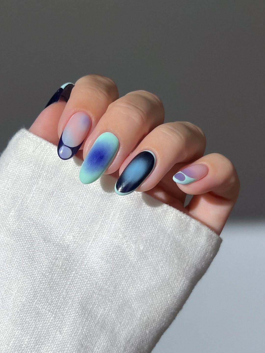 Еще для одного пальчика тоже нужно сделать полное покрытие, но в этот раз темным оттенком. Потом добавь на него голубую ауру, но самой важной деталью станет рамка. Дизайны ногтей с рамочками сейчас еще актуальнее, чем градиент, поэтому точно стоит использовать этот элемент в дизайне.