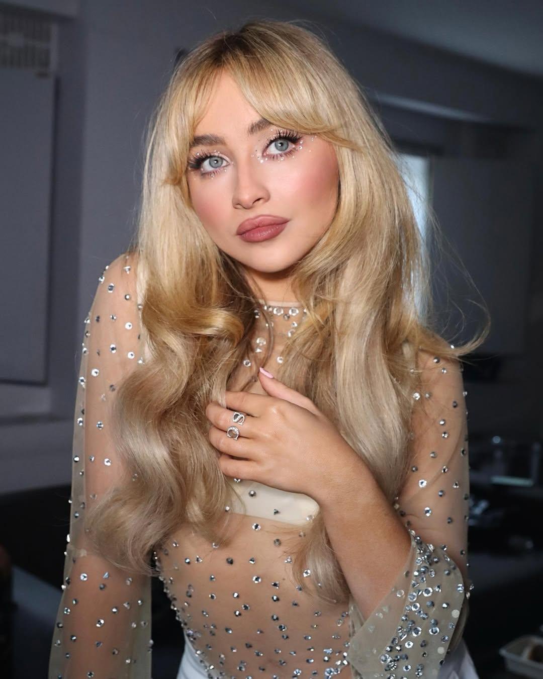 «Сиять, сиять и еще раз сиять» — девиз 2026 года. Обилие блесток снова возвращается в нашу рутину, и мы совсем не против! Они крайне универсальны: их можно закрепить как на скулах, так и на глазах, да даже на лбу, имитируя определенный рисунок. Сабрина решила остановится на втором варианте и ничуть не прогадала.