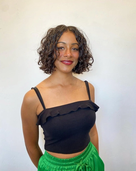 Кудрявые волосы и японский боб могут показаться несовместимыми, но на самом деле это интересная комбинация. Четкий срез на кудрях создает объемный, текстурный силуэт, который сохраняет геометрию. Завитки добавляют объем и движение, делая стрижку менее строгой, но все равно структурированной. Важно, чтобы мастер был профессионалом: неправильно постриженные кудри могут превратить боб в треугольник или бесформенную массу.
