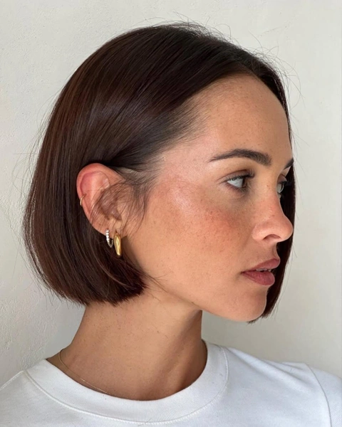 Базовая версия — прямой срез на уровне челюсти или чуть ниже, волосы одной длины. Это самая графичная и строгая интерпретация стрижки. Линия среза идеально ровная, как по линейке, что создает четкий силуэт. Классический японский боб лучше всего смотрится на прямых или слегка волнистых волосах средней густоты. Укладка минимальна: высуши волосы феном, направляя их вниз, и все. Стрижка держит форму сама благодаря точности среза.