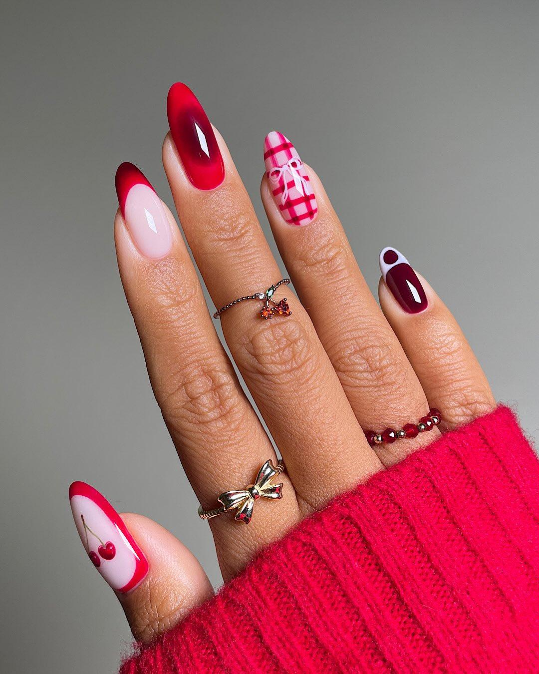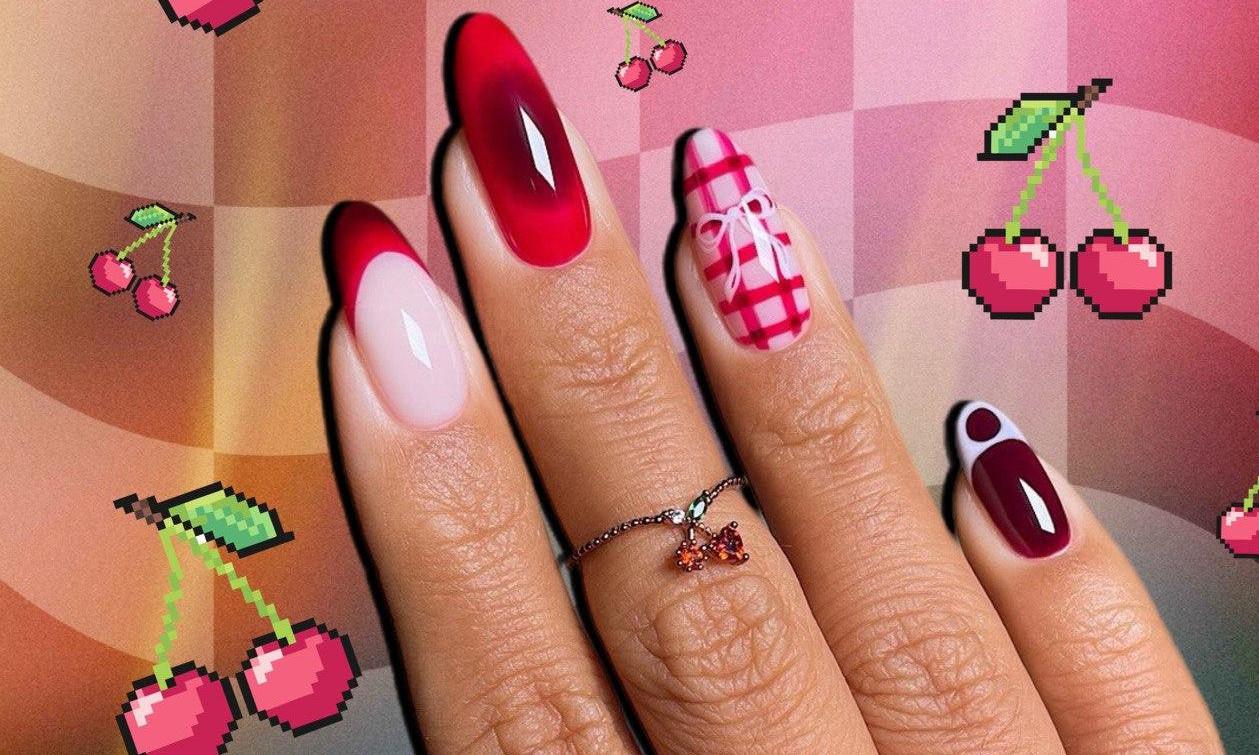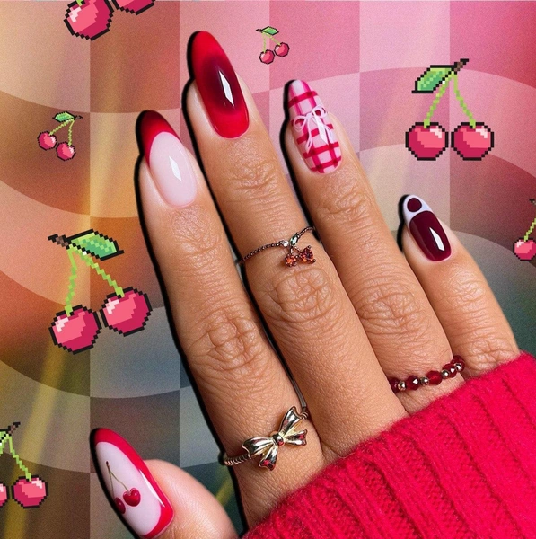 Еще на одном ногтей можно нарисовать узор в клеточку. Он вписывается в стиль преппи, который актуален в осеннем сезоне. Для этого узора советую смешать красный лак с каплей прозрачного, чтобы линии получались более воздушными. Поверх нарисуй розовый бантик 🎀 Это придаст маникюру летний вайб, но при этом и большую нарядность.