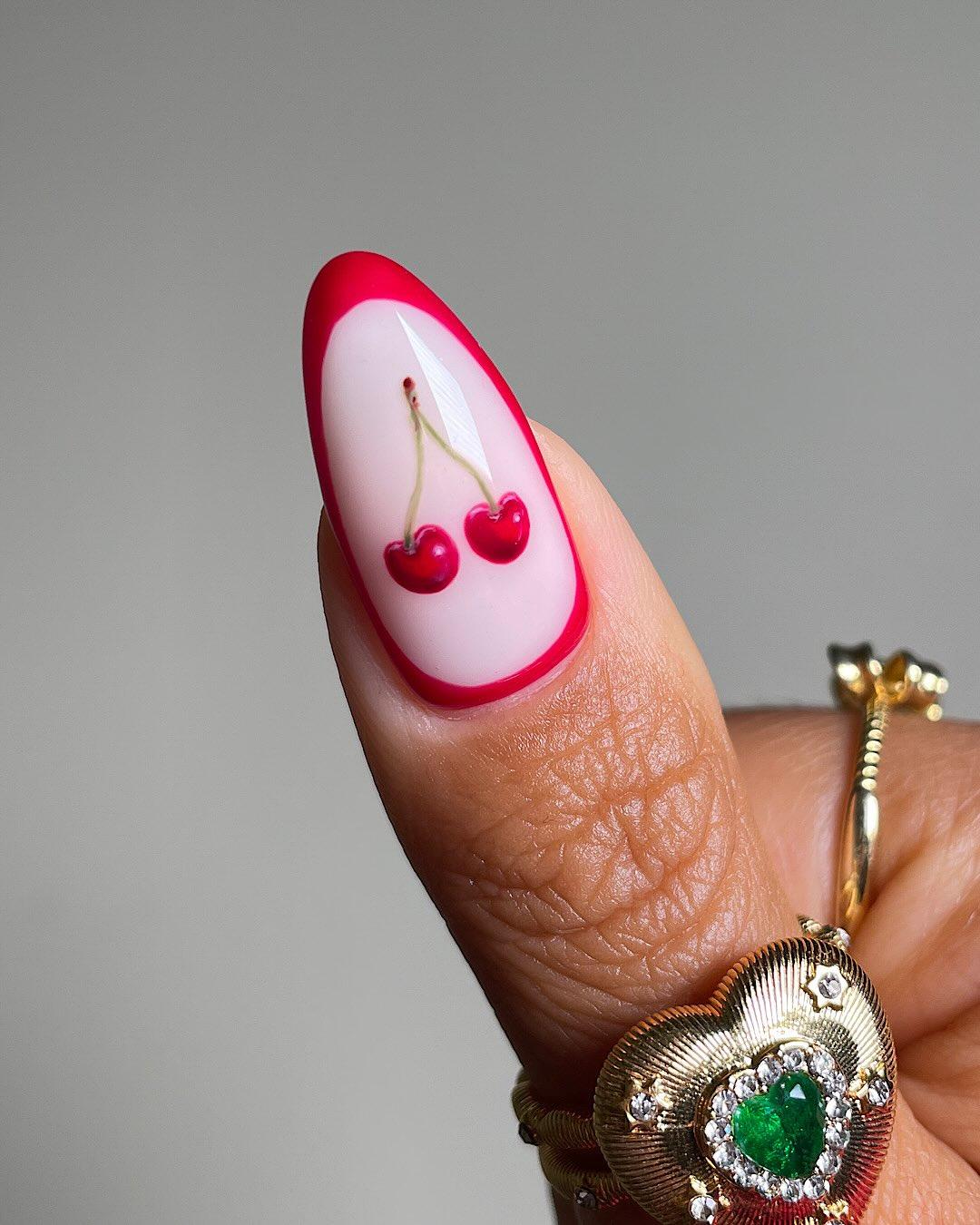 А ноготь большого пальца рекомендую украсить рисунком вишни. Размести его прямо в центре ногтя. Если не умеешь рисовать, то выбери наклейки, слайдеры или стемпинг. А по краю ногтя нарисуй красную рамку. Это сделает дизайн более завершенным. Такой яркий маникюр будет поднимать тебе настроение даже в серый и дождливый осенний денек ☔