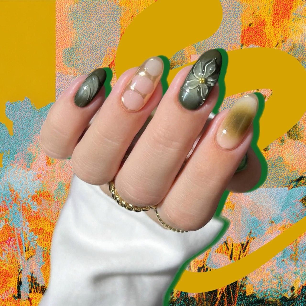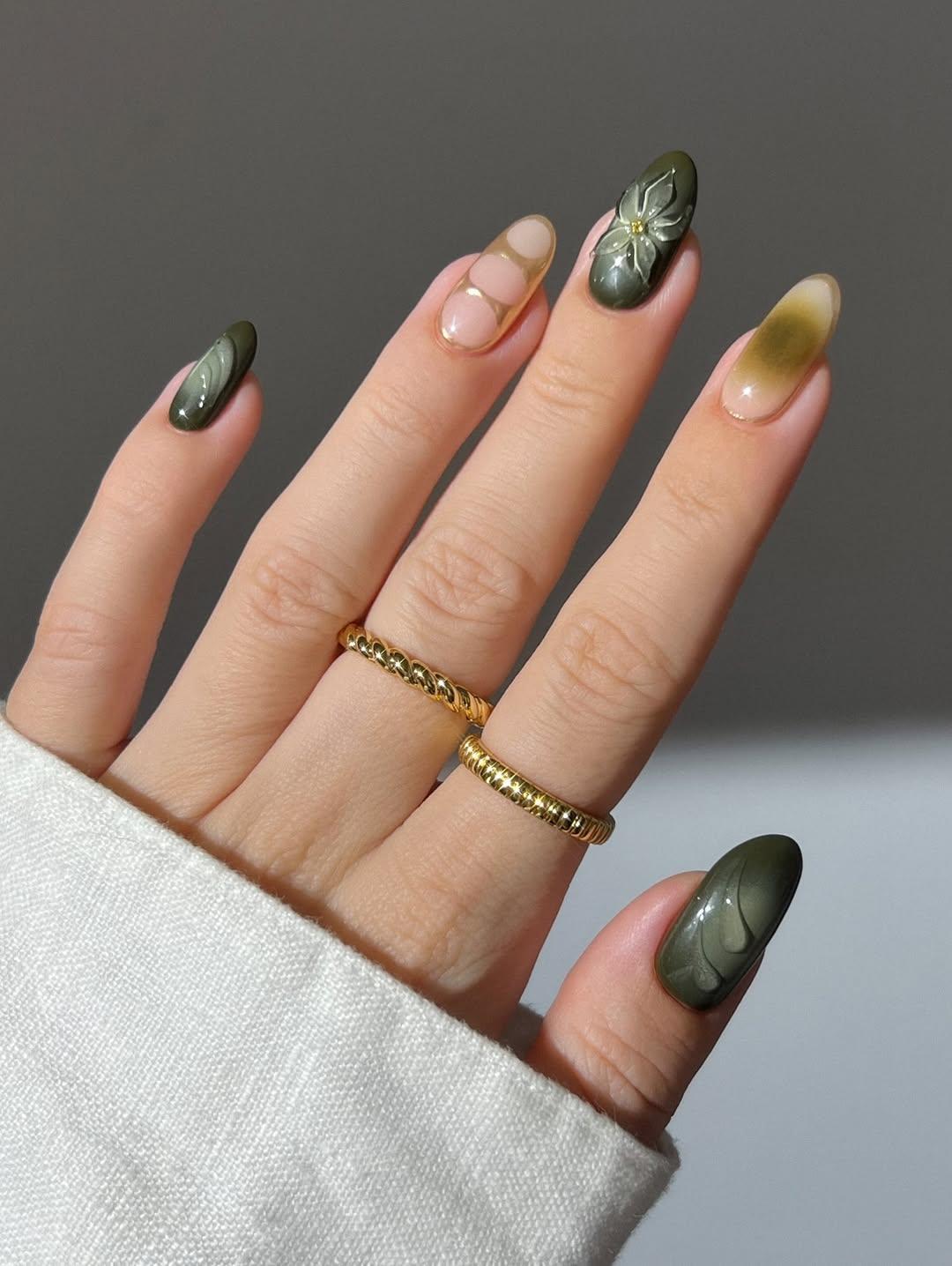 Ну а ты можешь выбрать более спокойный вариант дизайна ногтей. Если не любишь яркость, то приглушенные оттенки хаки тебе понравятся. А блестки можно заменить на деликатное золотое сияние. Дополни покрытие рисунком ауры, и твой маникюр превратится в прекрасный аксессуар. Давай смотреть, как сделать такой дизайн 👇