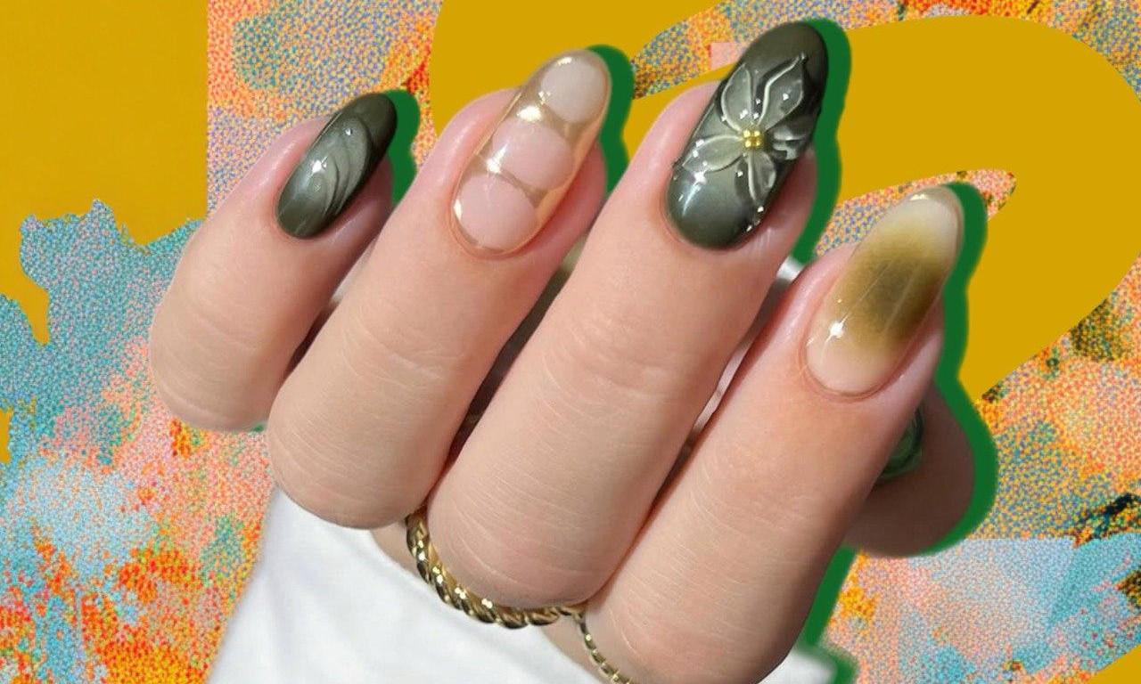 Оставшиеся пальцы лучше украсить чем-то другим. Например, той же аурой, но на другом фоне и в другом цвете. Нанеси молочный лак на базу, а потом прямо сверху рисуй зеленую ауру. Можешь выбрать более яркий оттенок — лаймовый или фисташковый. А по контуру обведи ноготь золотым лаком, создавая рамку. Сейчас такой вид дизайна тоже очень актуален.