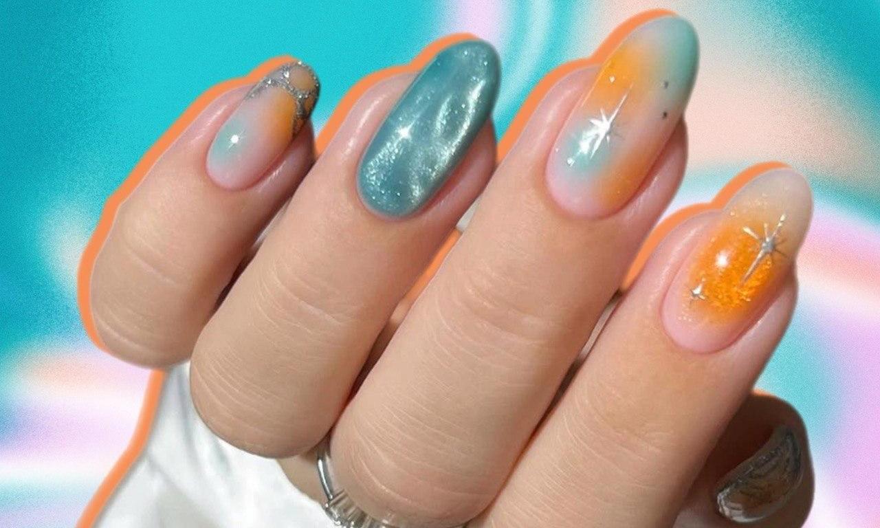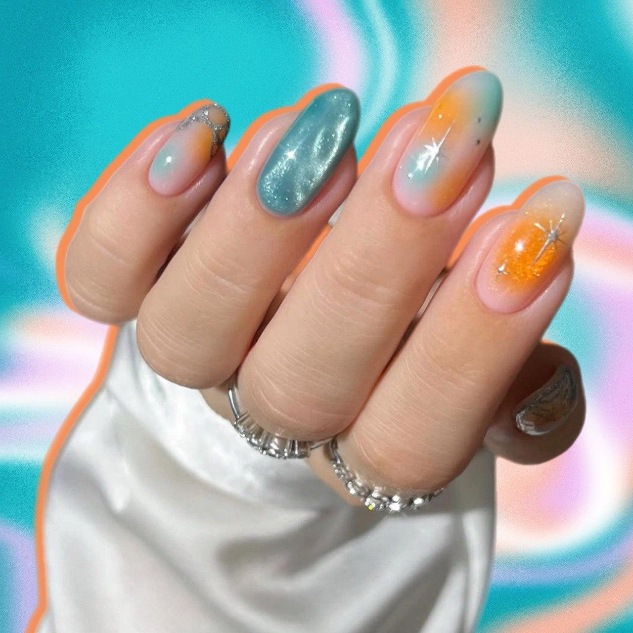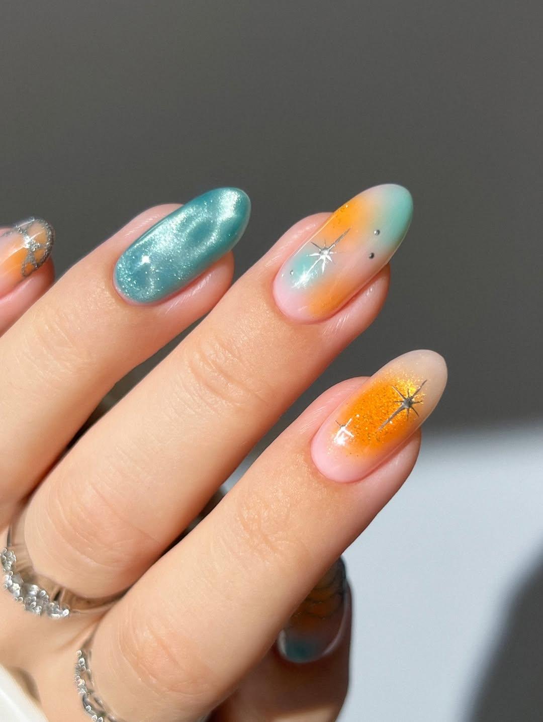 А оранжевый магнитный лак нанеси на другой ноготь в виде градиента-ауры. Такой маникюр смотрится изящно и воздушно, несмотря на яркий оттенок. Если хочется чего-то сочного, но без перебора — это твой вариант. Можешь украсить дизайн звездочками или стразами, например.