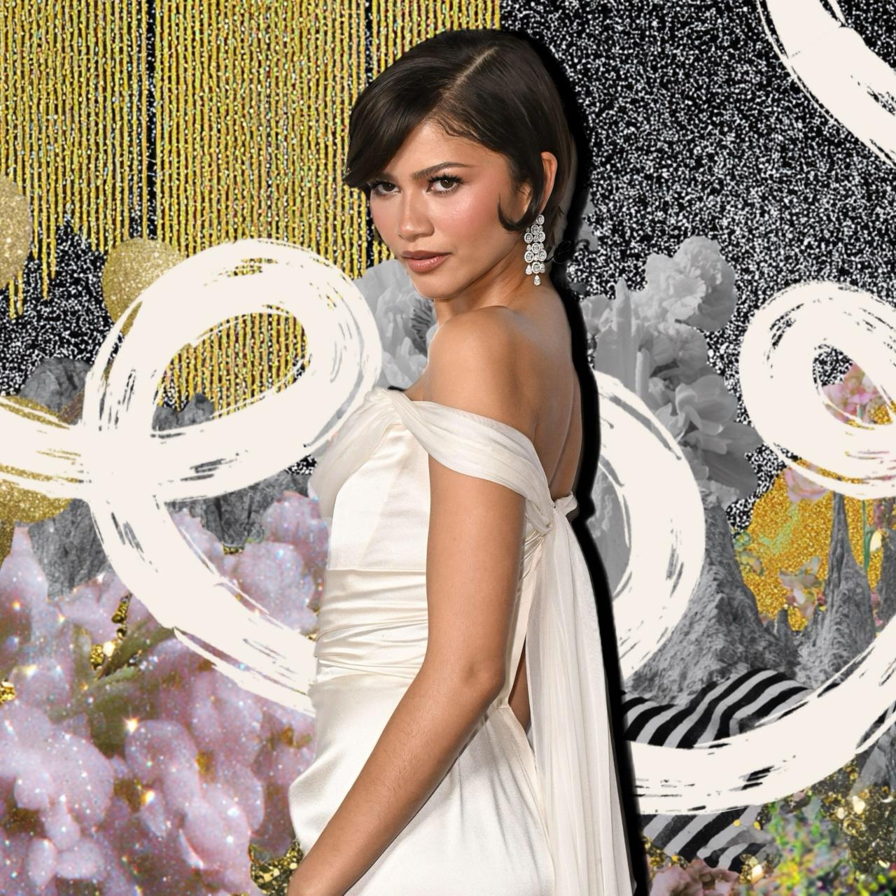 Новая версия образа получилась почти свадебной: открытые плечи, корсетный силуэт, деликатные украшения и минималистичный стайлинг. Прическа Зендеи — короткий боб с глубоким боковым пробором и аккуратные завитки у лица. А макияж — красивый и нежный нюд, который только усиливает ассоциации с эстетикой невесты. Но вообще-то его можно носить не только на свадьбе. Давай повторять такой мейк 💅