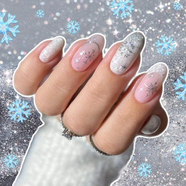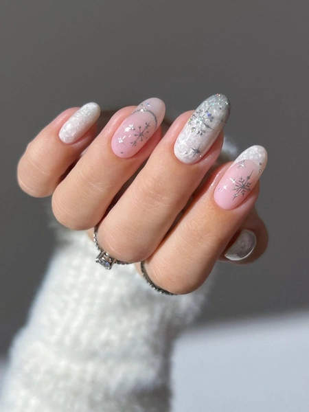 На ногте с однотонным покрытием сначала сделай серебристый френч в виде градиента на кончике. Выбирай лак с голографическим эффектом или светоотражающими блестками. Затем нарисуй снежинку и все те же звезды с точками. Тоже будет нарядно!