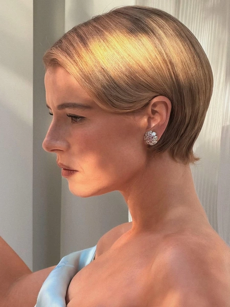 Короткий боб, граничащий с пикси, в золотом оттенке выглядит невероятно нарядно. Тренд на эту прическу задала Джесси Бакли, так что предлагаю вдохновляться именно ее луками. Актриса выбирает аккуратную стрижку с ровными и плавными линями и окрашивание цвета теплого блонда, который так удачно смотрится в сиянии солнцечных лучей.