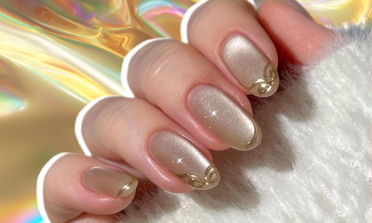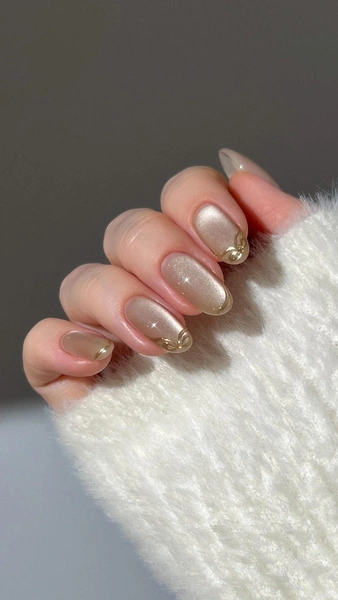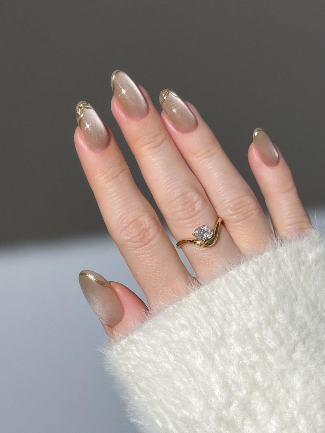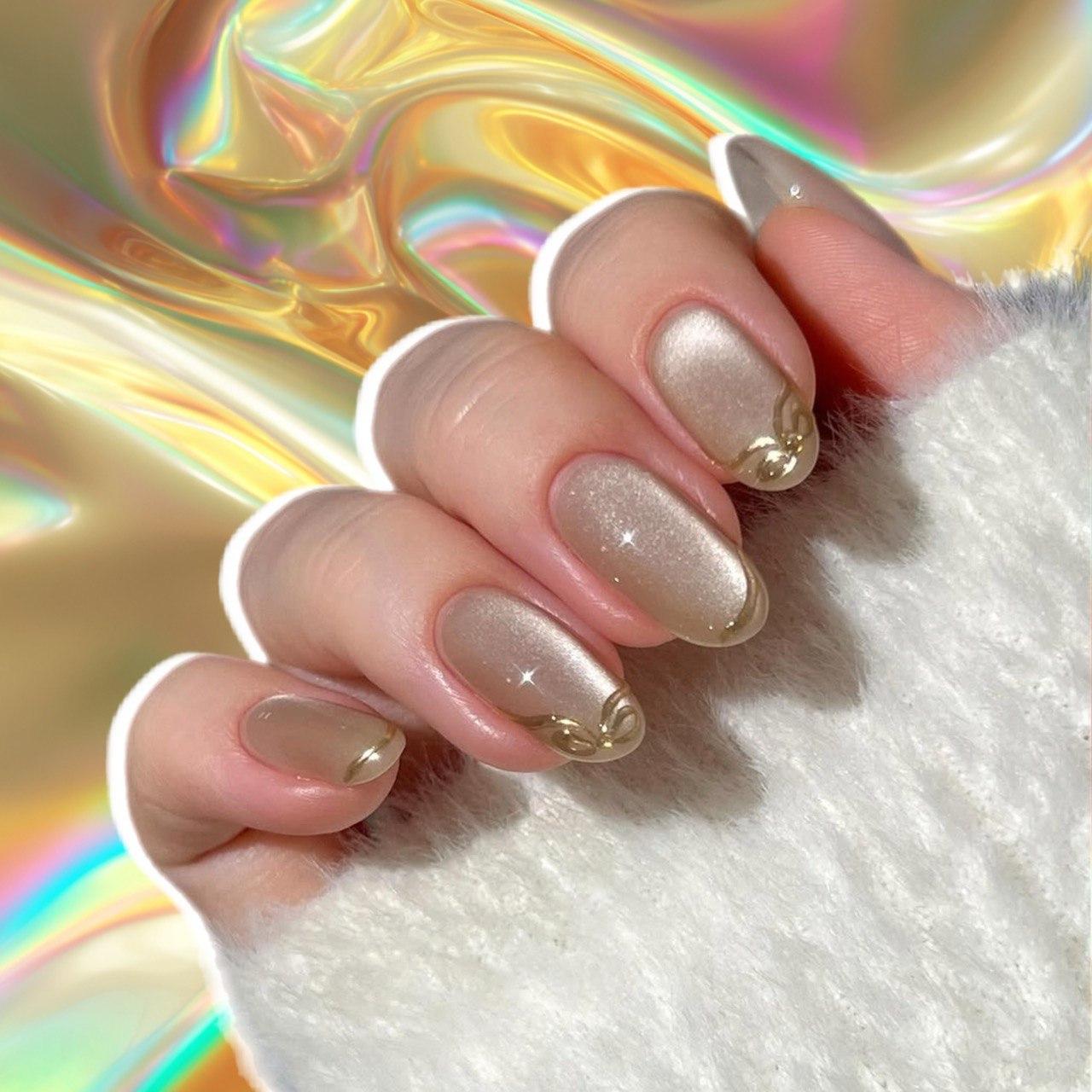 На нескольких ногтях золотисто-бежевый «кошачий глаз» дополняется френчем в виде ультратонкой золотой линии. Он выглядит как изящная окантовка, которая мягко подчеркивает форму ногтя. Линия почти растворяется в общем сиянии, но именно она придает дизайну структуру и ощущение продуманности.
