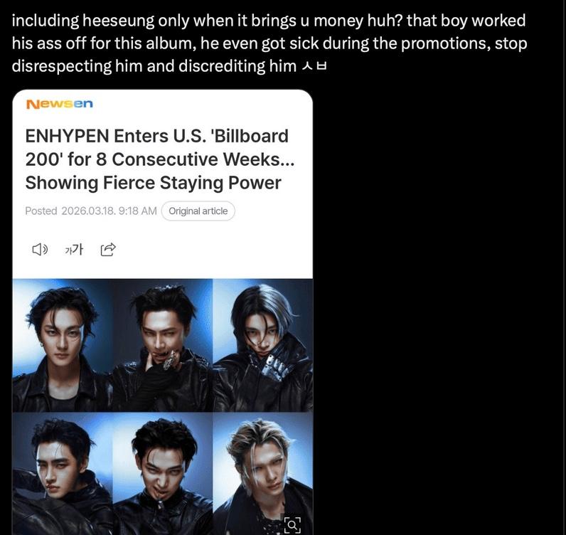 Компания BELIFT LAB столкнулась с волной критики после публикации, посвященной достижениям группы ENHYPEN. Пост был приурочен к успеху коллектива в чарте Billboard 200, где их альбом удерживается уже восемь недель подряд. Однако вместо поздравлений и обсуждения успеха внимание фанатов быстро переключилось на другой аспект — отсутствие Хисына на изображении, прикрепленном к публикации.