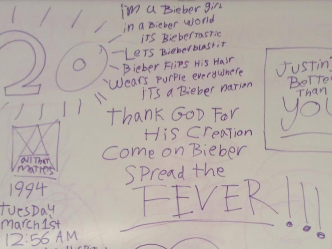 На втором слайде — доска, на которой юная Билли фиолетовым маркером написала текст песни «Barbie Girl» группы Aqua, а также вывела дату рождения Бибера (1 марта) и место рождения — Канада. А дальше — крик души: «Я фанатка Бибера. В мире Бибера все просто супер, давайте делать так, как делает Бибер. Пусть он взъерошит волосы, наденет фиолетовое. Это нация Бибера, слава богу за его творчество! Давай, Бибер, распространяй ЛИХОРАДКУ!».