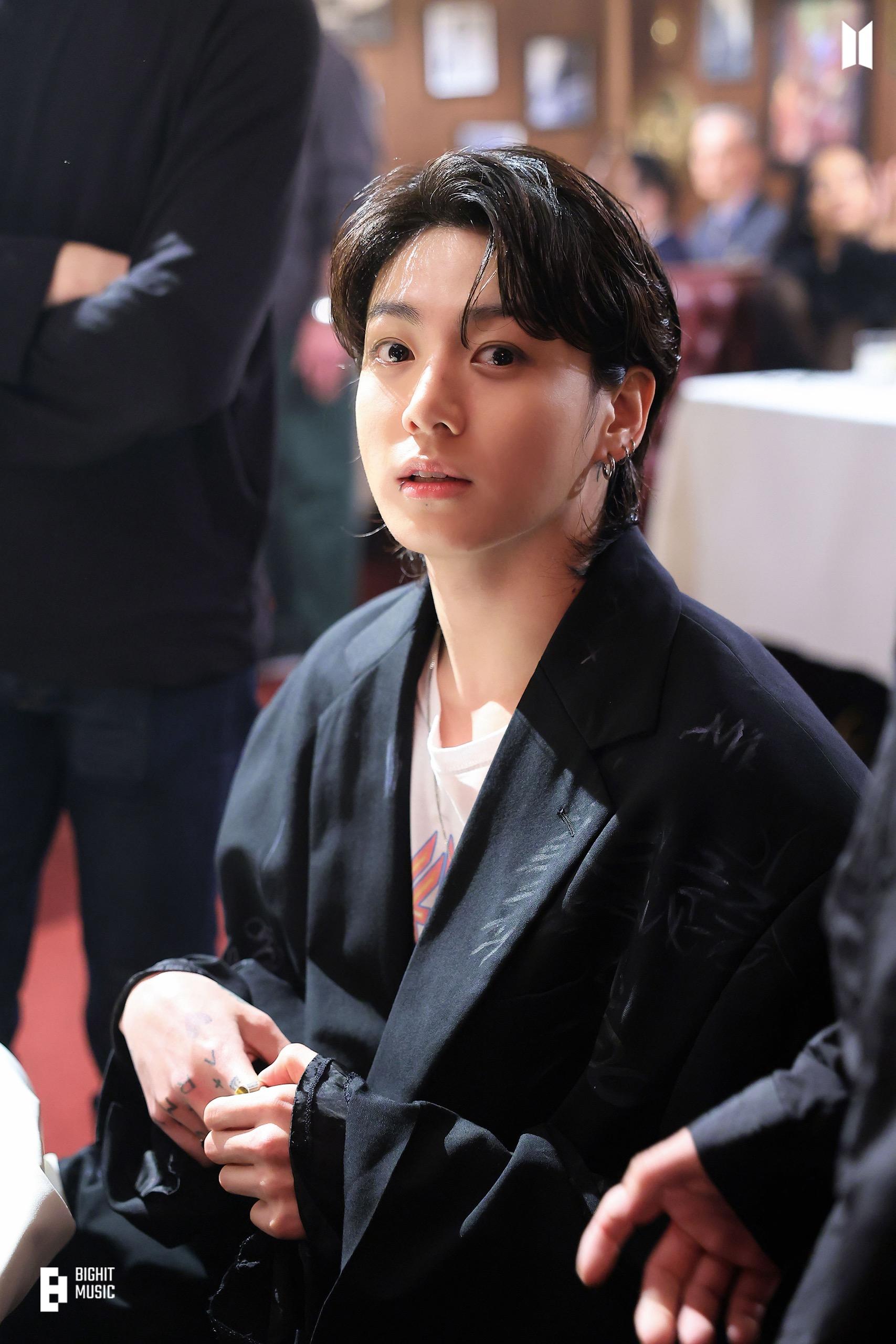 Для мероприятия Чонгук выбрал лаконичный, но стильный образ — полностью черный аутфит, дополненный серебряной цепочкой. Его минималистичный, но харизматичный стиль моментально привлек внимание фотографов и поклонников.