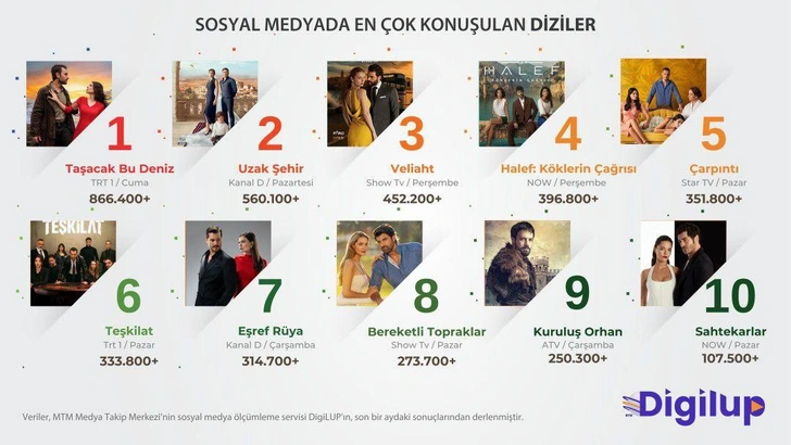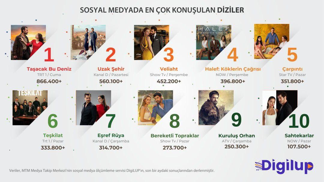 Почти бессменно в топ-10 самых обсуждаемых проектов входит «Разведка», и лишь после нее идет «Мечта Эшрефа», что странно, ведь сериал с Демет Оздемир и Чагатаем Улусоем стал самым просматриваемым на онлайн-платформах за последнее время. Видимо, сюжет такой напряженный, что писать в социальные сети аудитория просто не успевает.