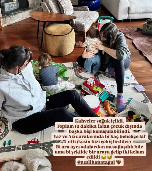 Актрисам пришла в голову идея познакомить своих детей друг с другом, правда, закончилось все так, как и у других «мам». Кофе пришлось пить холодным, а поговорить друг с другом дольше десяти минут на темы, которые не связаны с малышами, не удалось. Тем не менее, можно считать, что такое «мероприятие» положило основу будущей крепкой дружбы сына Неслихан по имени Азиз и дочери Гизем, которую зовут Лейла.