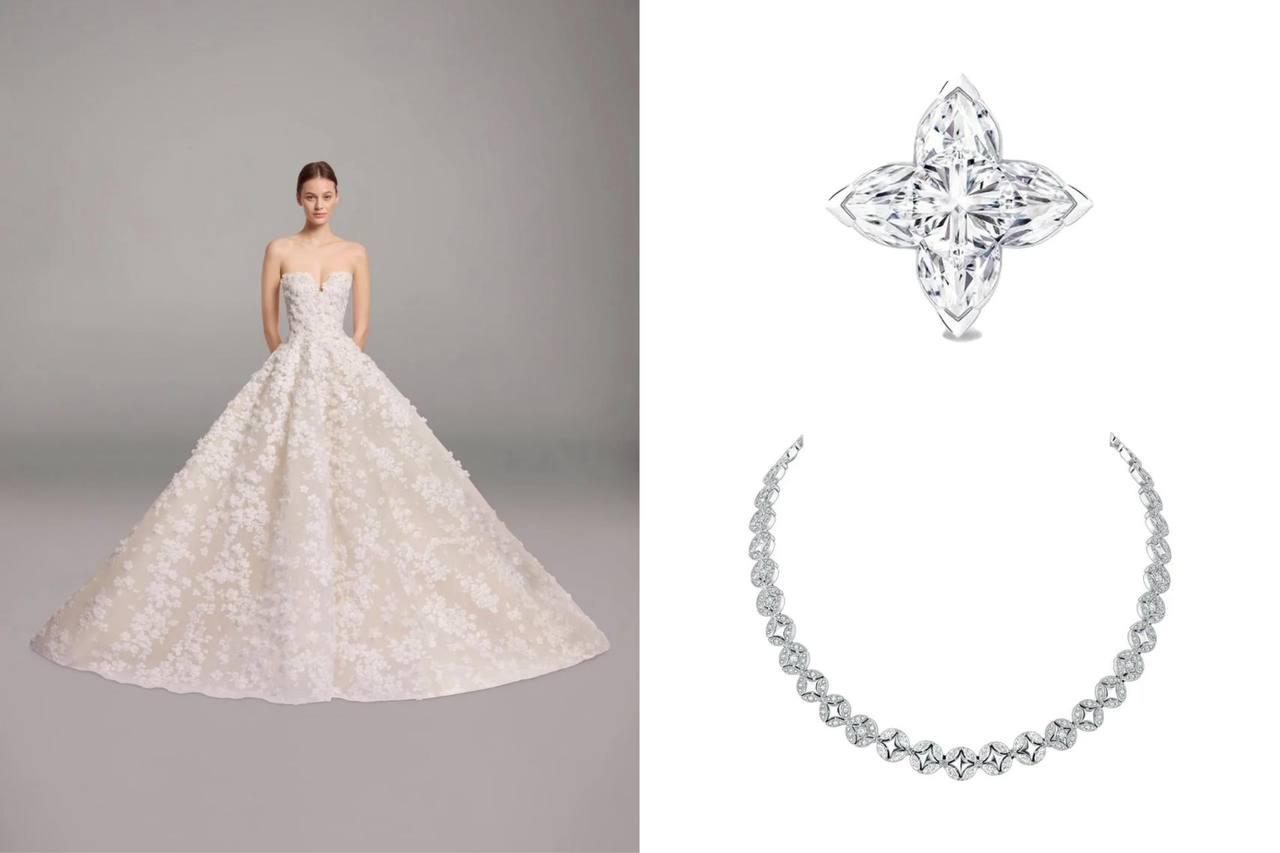 Однако настоящую сенсацию произвели украшения невесты. Шин Мина дополнила образ ювелирными изделиями из коллекции Louis Vuitton Fine Jewelry. Центральным элементом стало ожерелье с более чем 11 каратами бриллиантов — 452 камня классической огранки и 20 navette-cut.