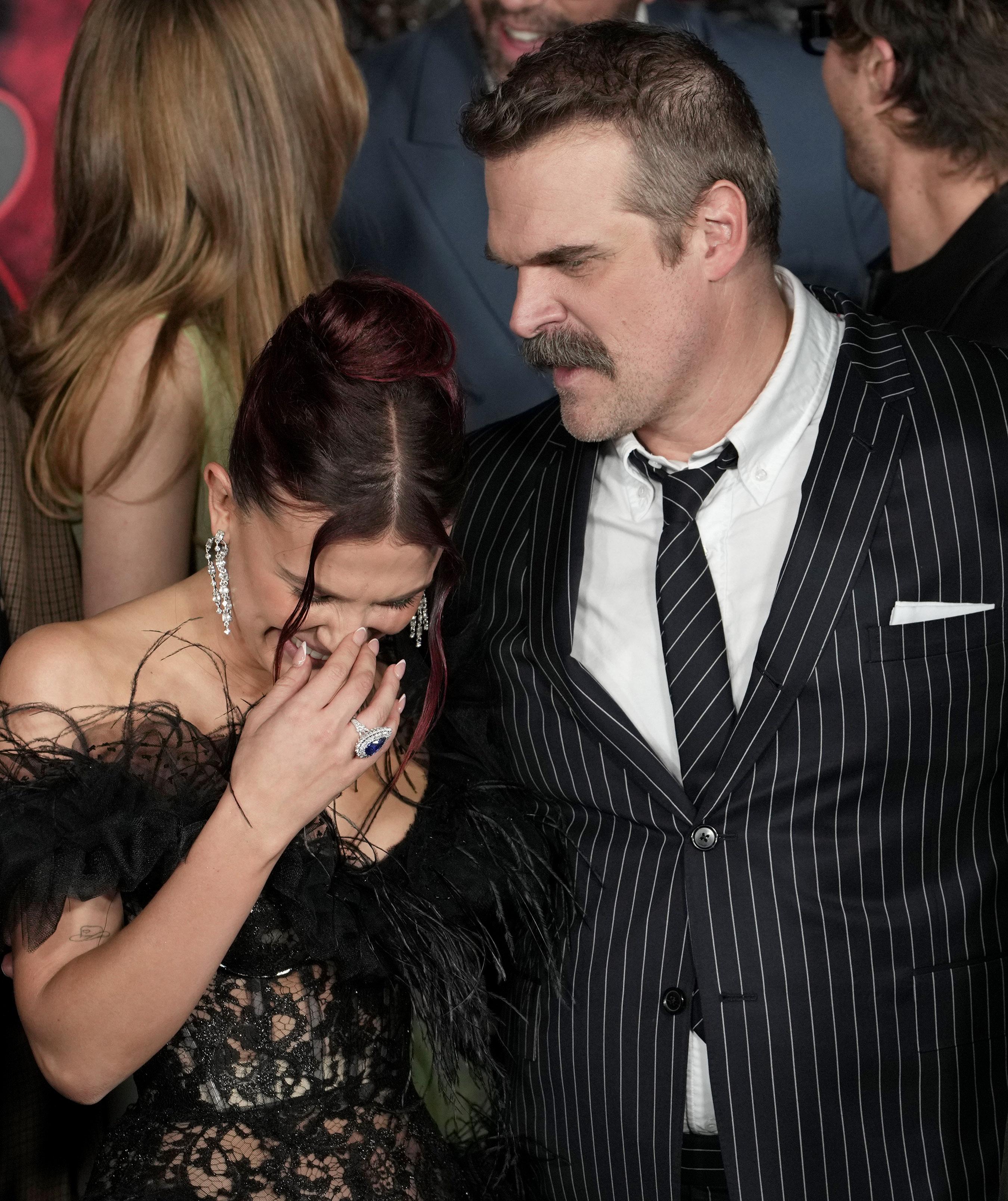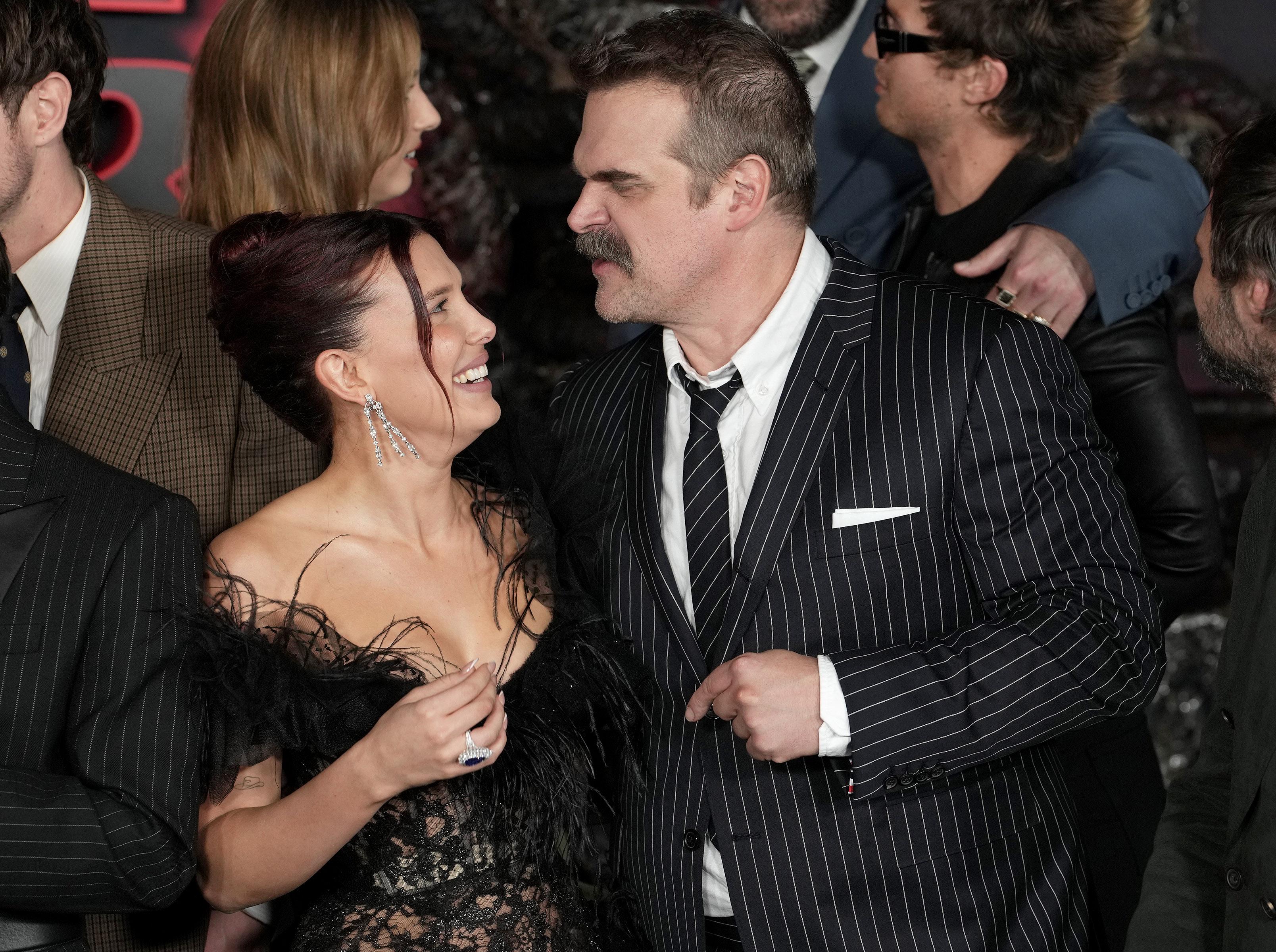 На фотографиях с презентации пятого сезона «Очень странных дел», которыми я делюсь с тобой ниже, можно увидеть, как Милли Бобби и Дэвид мило общаются друг с другом, смеются и даже обнимаются. Казалось бы, ничего такого: обычное поведение звездных друзей на красной дорожке. Но только ленивый не видел новости начала этой недели, которые повергли фандом «Очень странных дел» в настоящий шок.