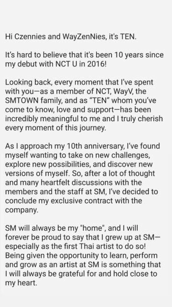 В дальнейшем я продолжу деятельность как Тэн из NCT и WayV. В то же время я с нетерпением жду возможности показать новые стороны «TEN» и развиваться как сольный артист в этой новой главе! Пожалуйста, продолжайте поддерживать NCT, WayV и меня». С любовью, Тэн».