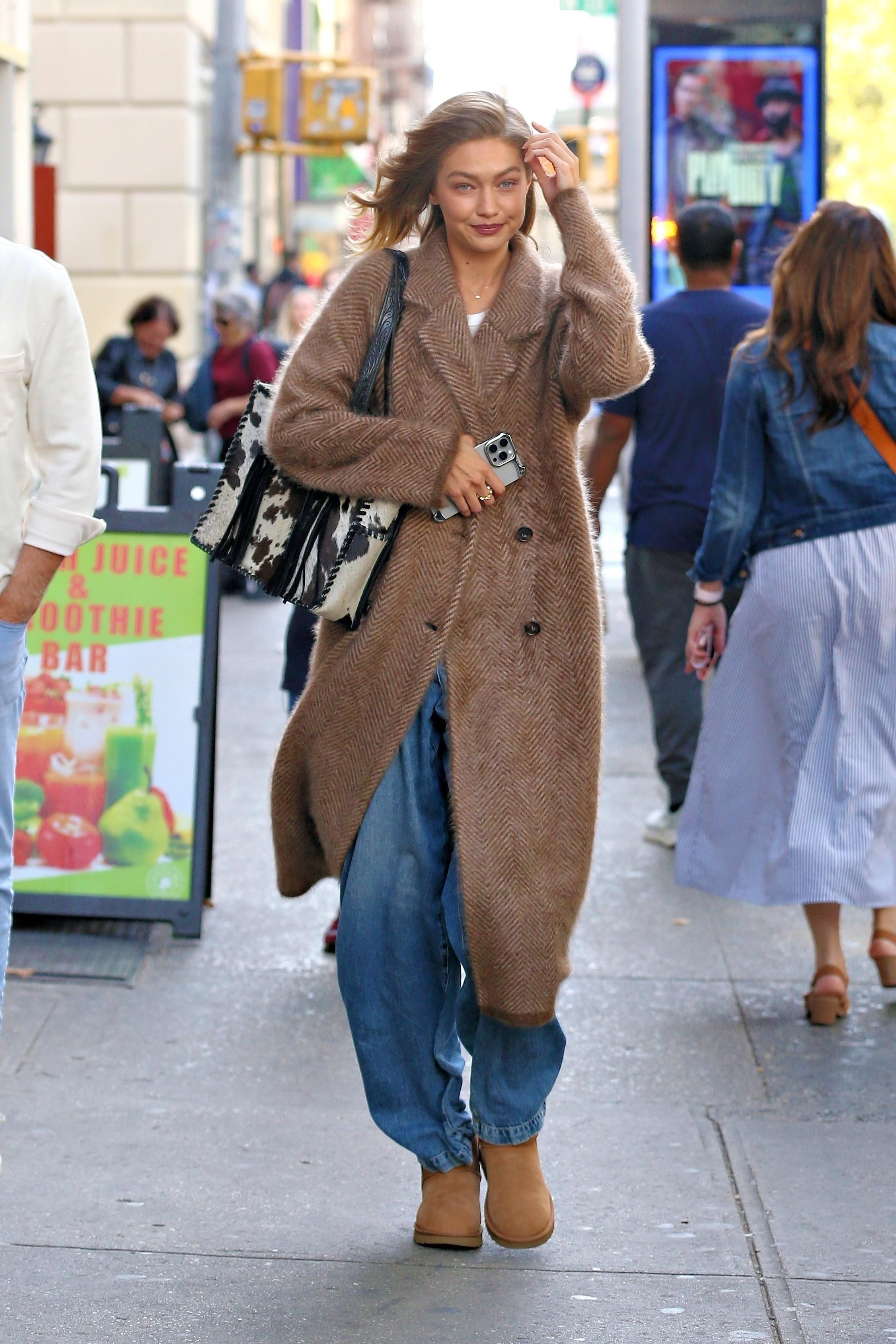 Угги этой зимой окончательно закрепили статус городской обуви. Джиджи Хадид носит их с элегантными пальто, дубленками и любыми джинсами. Это комфорт, который перестал быть компромиссом.