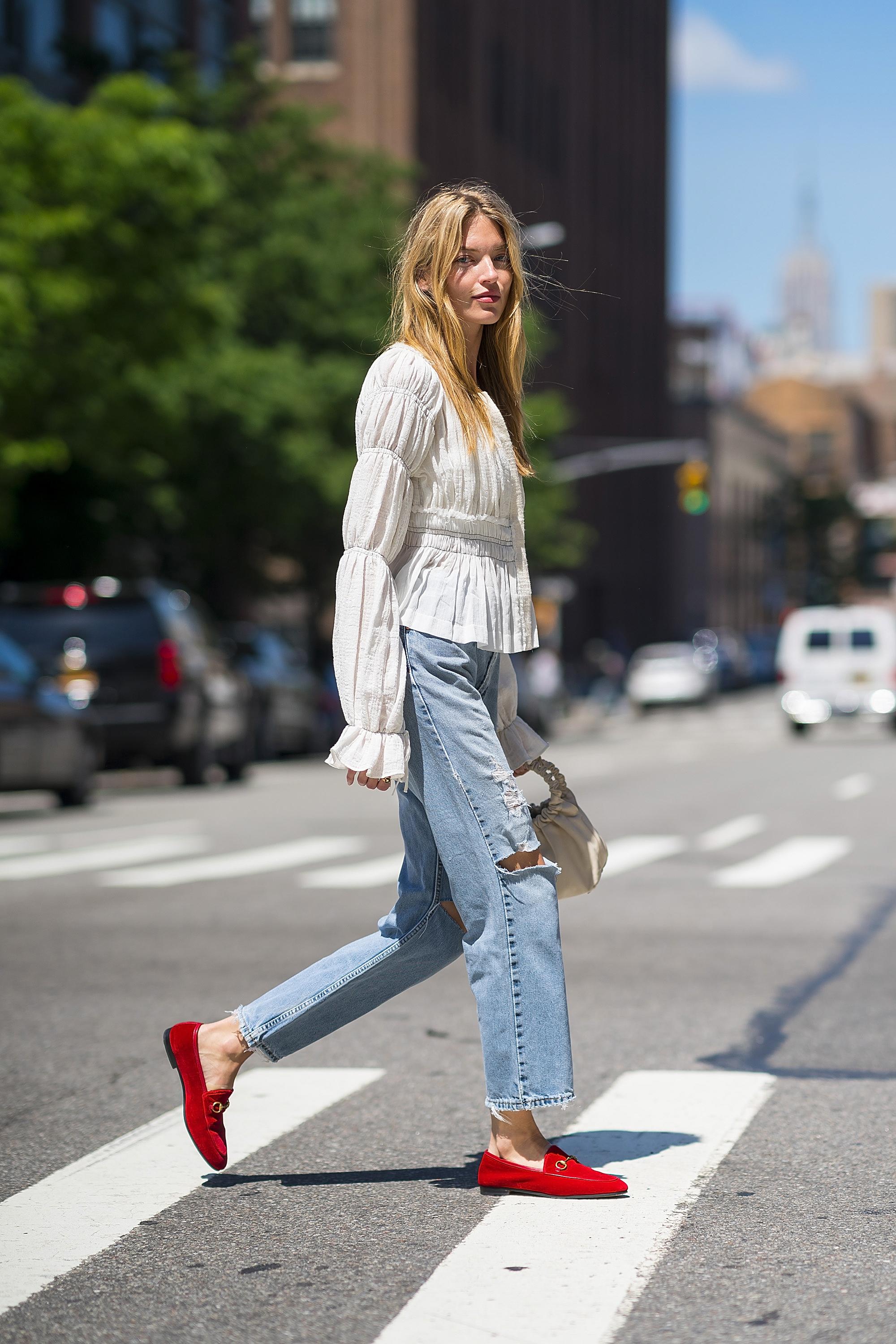 Классика, которая работает безотказно. Свежий голубой или синий деним и ярко-красная обувь создают контраст, который выглядит одновременно смелым и очень свежим. Это сочетание родом из французского стиля, где простая белая футболка, прямые голубые джинсы и красные балетки или мюли создают тот самый эффект небрежного шика. Идеально для прогулки по городу!