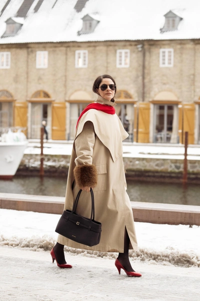 Универсальный плащ бежевого или песочного цвета — маст-хэв весеннего гардероба. Если надеть под него нейтральный базовый образ, то красные сапоги или туфли станут той самой изюминкой, которая превратит привычный лук в стильный. Получится очень по-европейски.
