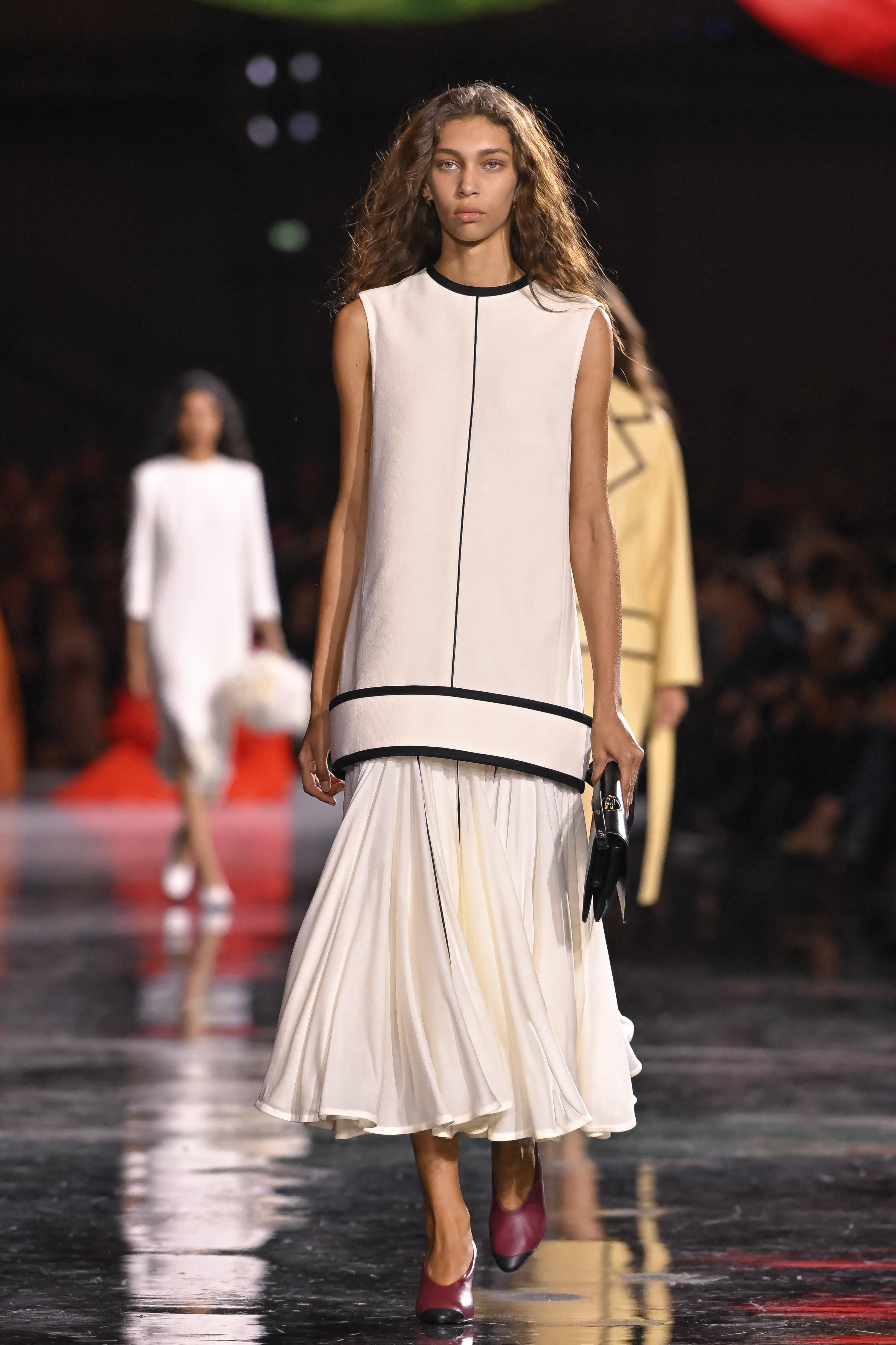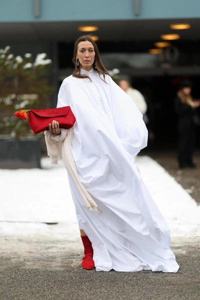 Романтичный и воздушный образ. Длинная струящаяся юбка белого цвета и красная обувь — это гимн весенней легкости и женственности. Сочетание выглядит празднично, но не пафосно. Верх можно выбрать простой — например, трикотажный топ или хлопковую блузу.