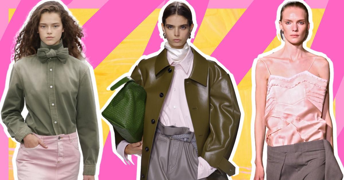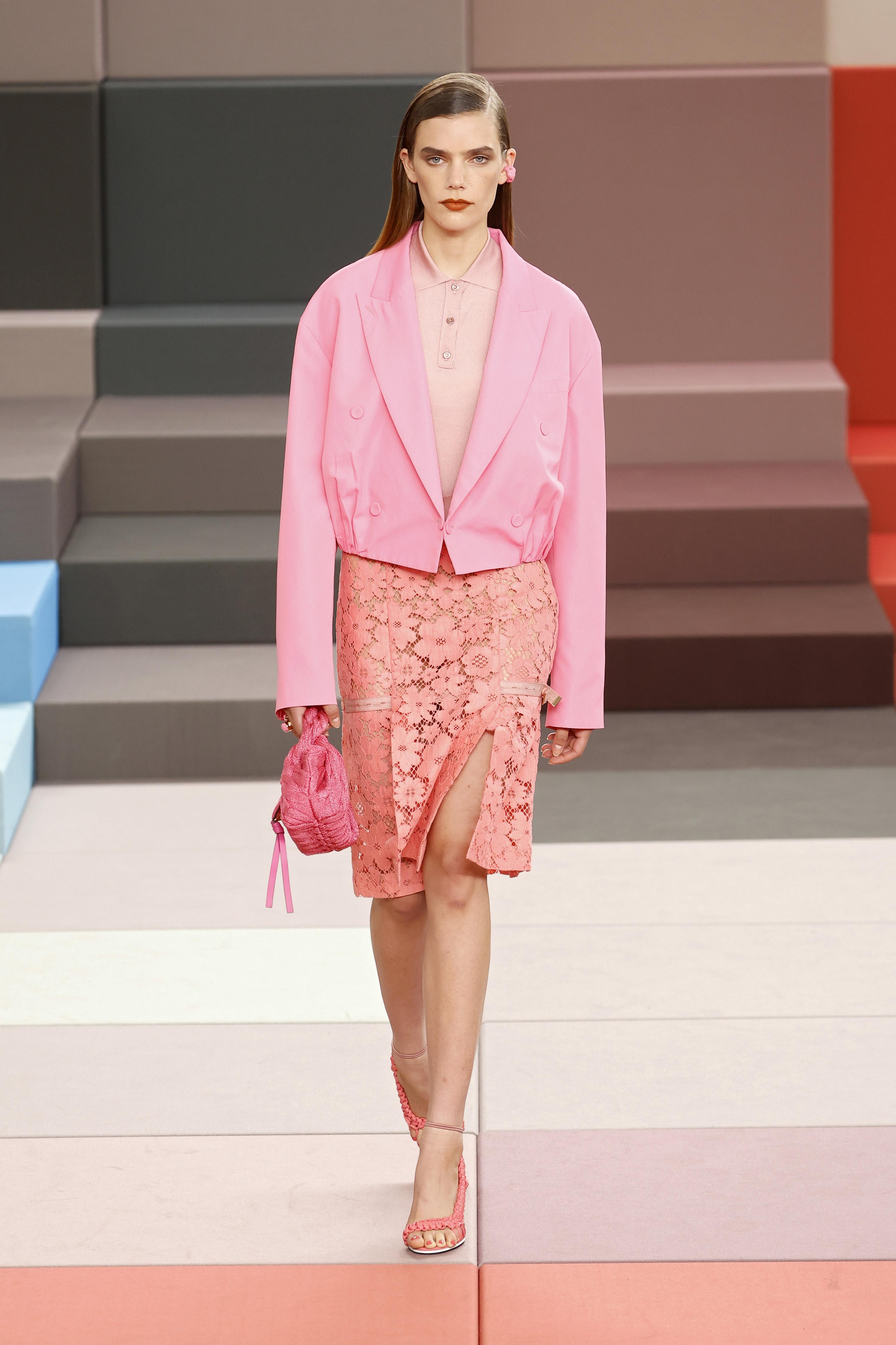 Мини в розовом цвете больше не про наивность. У Dior лаконичную юбку Джонатан Андерсон соединил с плотной рубашкой цвета хаки и карамельными лодочками. В итоге образ выглядит собранным и взрослым. Формула простая: короткий низ — строгий верх, спокойные аксессуары и минимум украшений.
