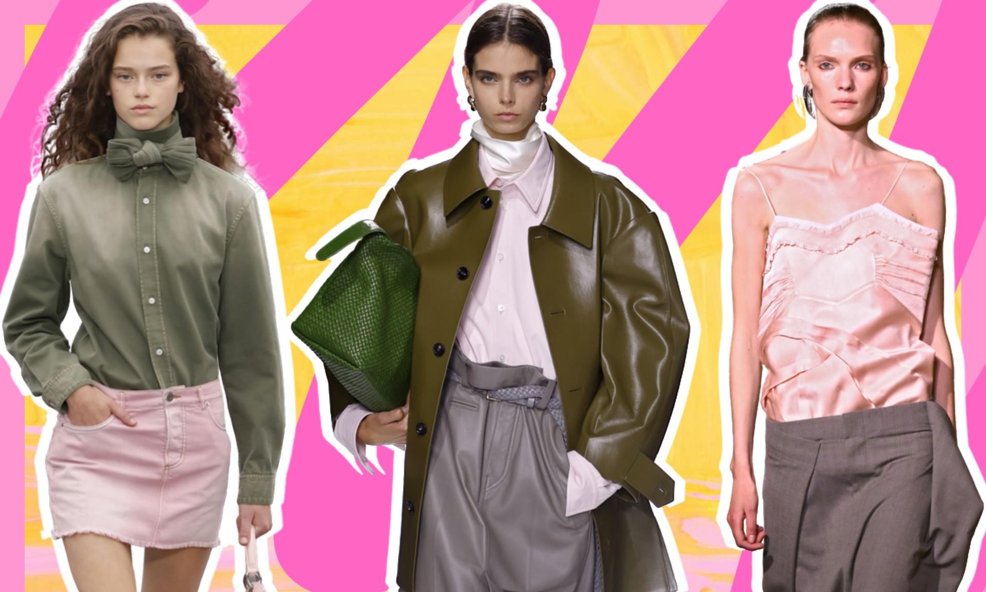 Базовая рубашка неожиданно становится главным союзником розового. Bottega Veneta нежно-розовую модель сочетает с серой кожаной юбкой, атласным шейным платком жемчужного оттенка и оливковым кожаным пальто. Этот прием точно стоит взять на вооружение, ведь розовый особенно круто раскрывается в окружении таких сложных, «земных» цветов. Если боишься выглядеть слишком мягко — выбирай матовую кожу, плотные ткани и приглушенные оттенки.