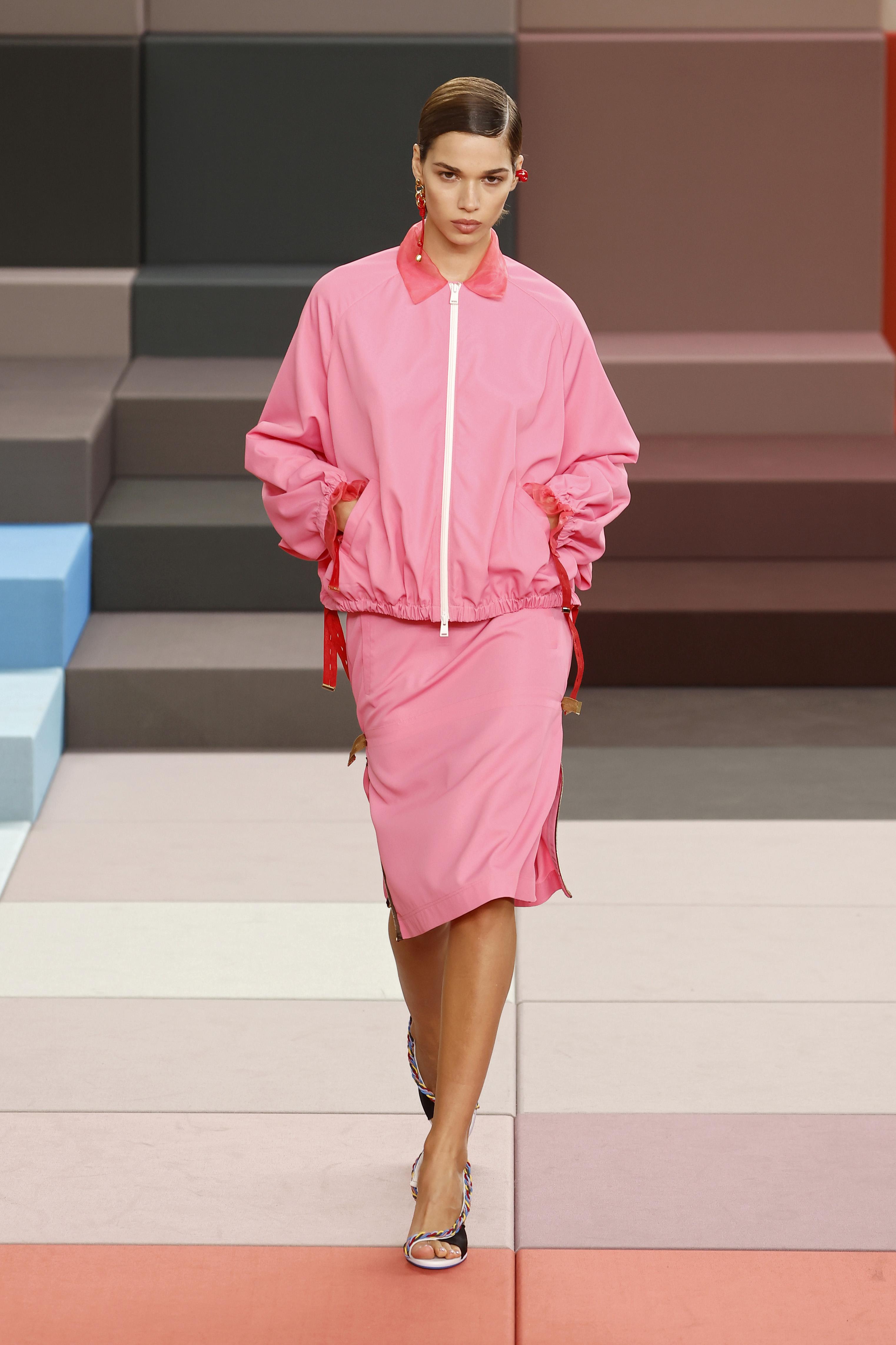 Спортивный крой и нежный цвет — неожиданно удачное сочетание. У Fendi розовый бомбер выглядит свежо и современно, без намека на инфантильность. Такой вариант особенно хорош для тех, кто вечно выгуливает базовый гардероб и хочет добавить цвет, не меняя привычный стиль.