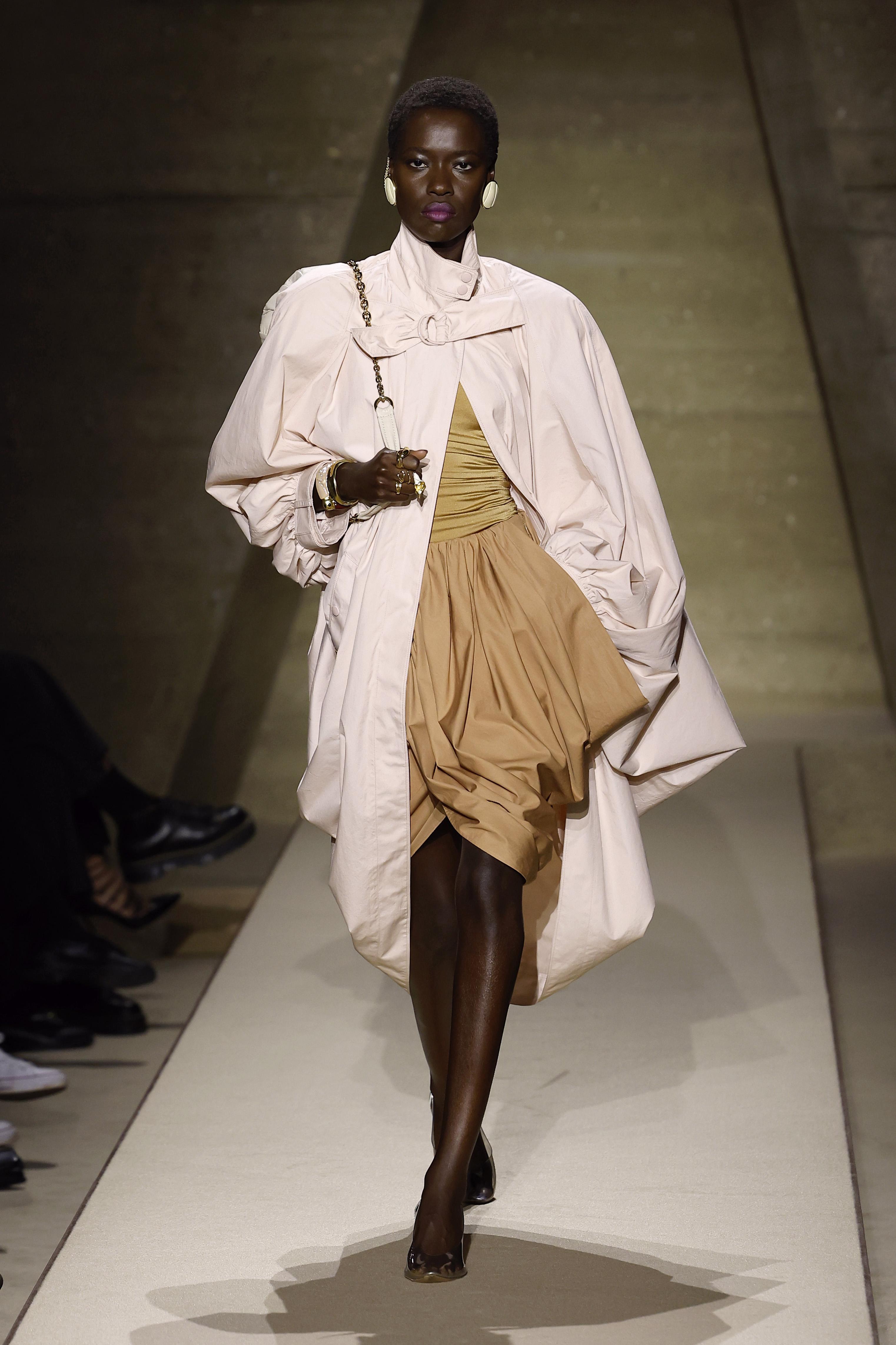 Тренч — один из самых безопасных способов впустить цвет в гардероб. В Chloé нежно-розовый плащ Чемена Камали сочетала с телесными оттенками и белой сумкой. Получился мягкий, светлый образ без излишней романтики. Такой плащ легко носить и с джинсами, и с деловыми брюками — он не перетягивает внимание, а аккуратно подсвечивает весь образ.