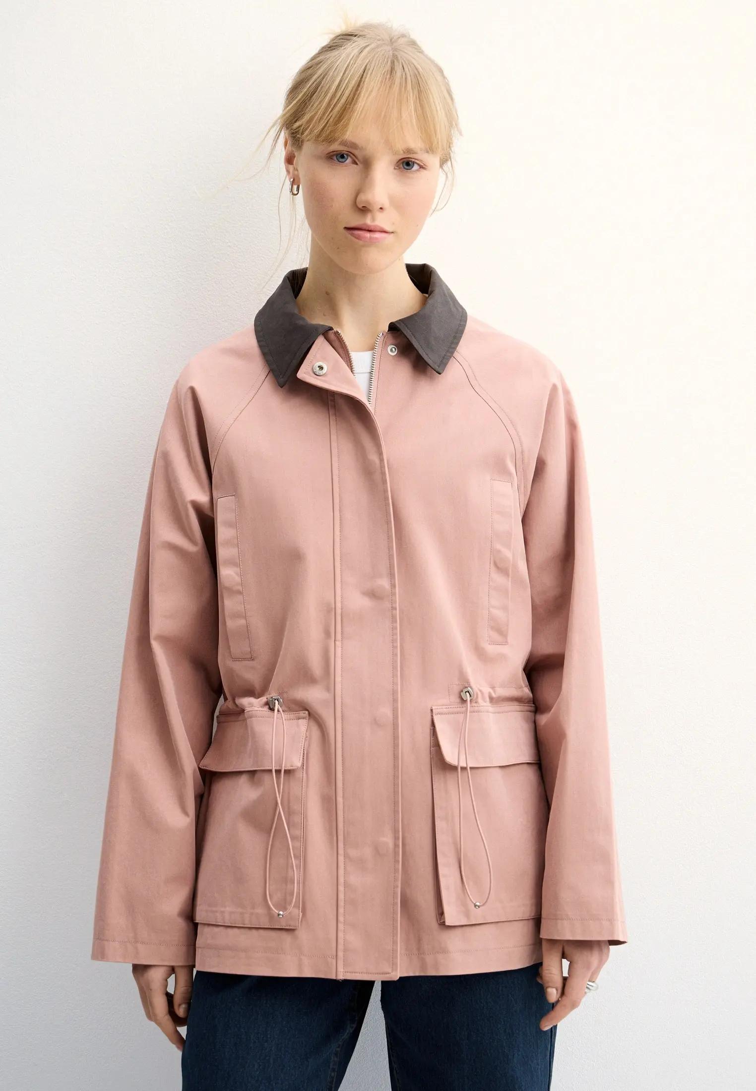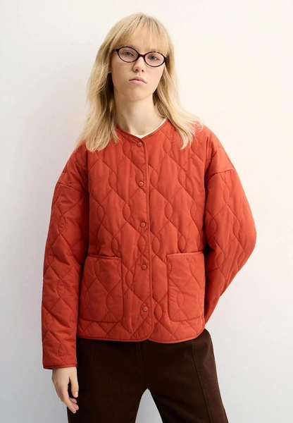 Аккуратная стеганая куртка без воротника, на пуговицах — еще одно сокровище для тех, кто любит многослойность. Она согреет весной, не даст промокнуть и при этом выглядит настолько лаконично, что под нее можно подстраивать любые образы.