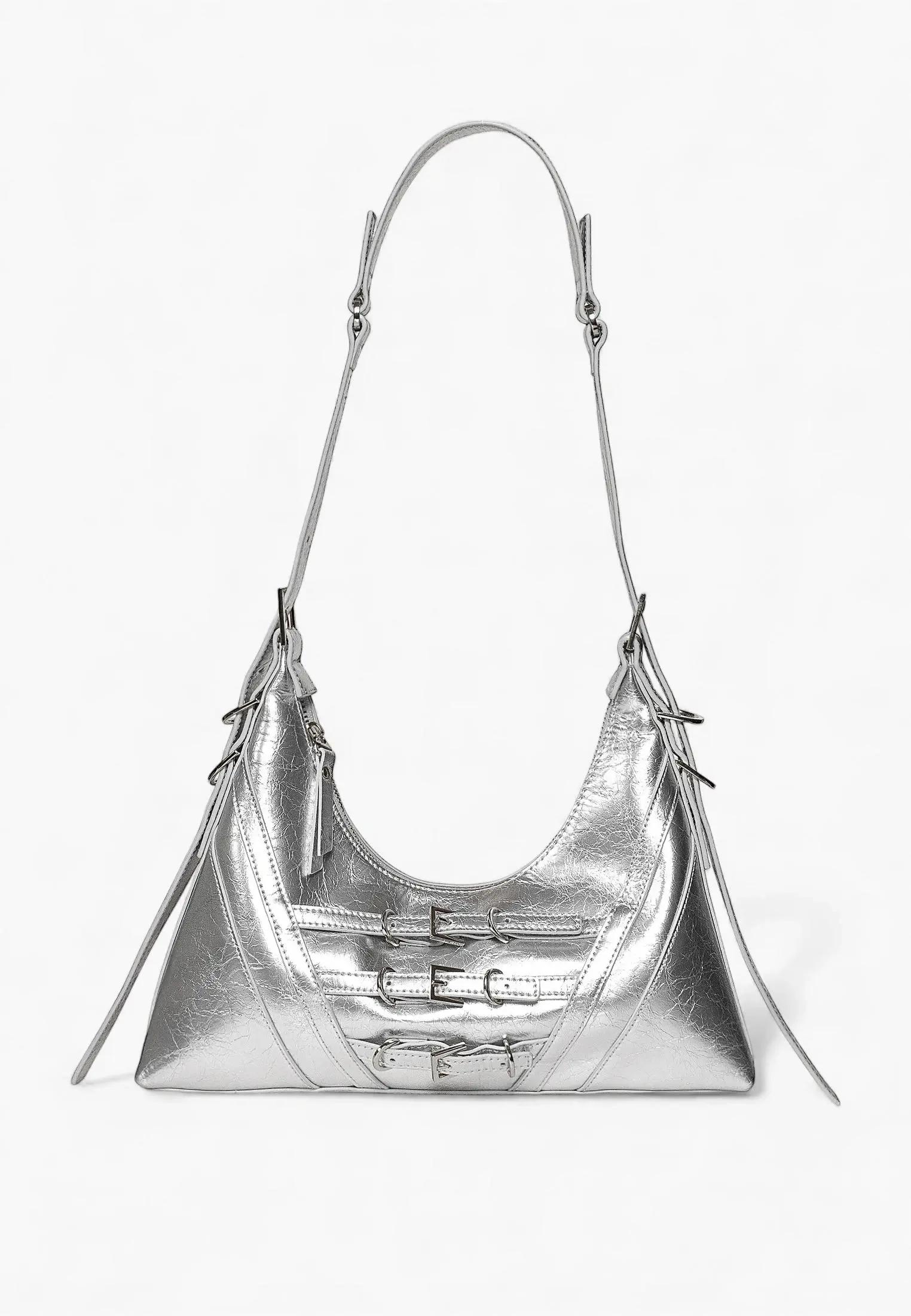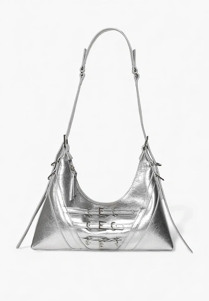 Если сама модель лаконичная, крупная фурнитура может взять на себя роль украшения. Золотые или серебряные застежки, пряжки, цепи, декоративные элементы делают сумку заметной и праздничной. Такой вариант подойдет тем, кто не хочет полностью блестящий аксессуар, но все же ищет акцент.