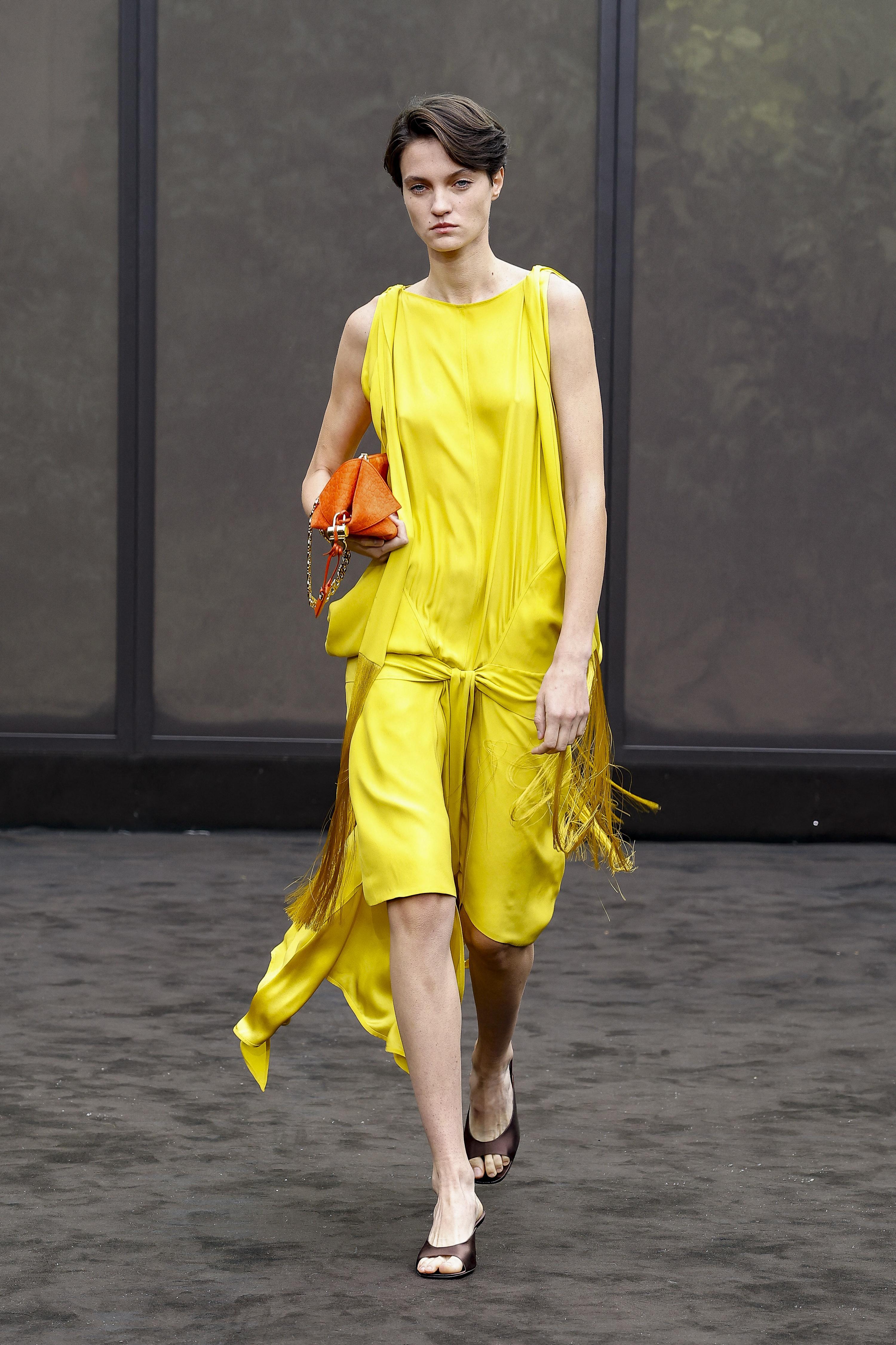 Буквально главный цвет сезона — сочный, насыщенный лимон. Он окончательно вытесняет мягкие кремовые оттенки и работает как визуальный антидепрессант. Лимонный проявился в платьях, костюмах, аксессуарах и даже обуви. Лучше всего он смотрится в простых формах, где сам цвет становится главным акцентом.