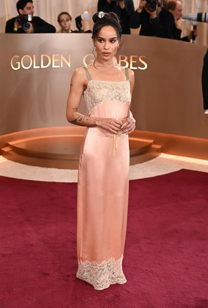 Минимализм с чувственностью никуда не ушел. Зои Кравиц появилась в платье-слипе, которое напоминало ночную сорочку, но выглядело уместно и собранно. Шелковое платье Saint Laurent в оттенке румянца с кружевной отделкой, тонкими бретелями и аккуратным поясом стало примером того, как бельевая эстетика выходит за пределы будуара и закрепляется на красной дорожке.