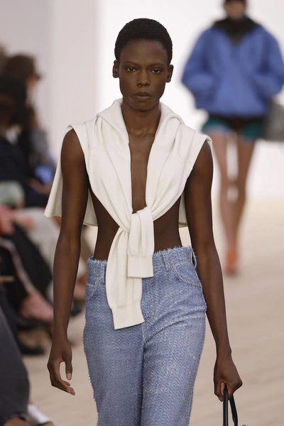 Знакомый всем прием, который по-прежнему в моде. На показах весна-лето 2026 модели выходили с джемперами, накинутыми на спину так, чтобы рукава свободно свисали спереди. Зимой это отличный способ добавить цвета или текстуры в образ, а заодно и перестраховаться: если станет холоднее, можно просто надеть дополнительный слой. Особенно эффектно смотрятся контрастные сочетания: светлый верх и яркий джемпер.