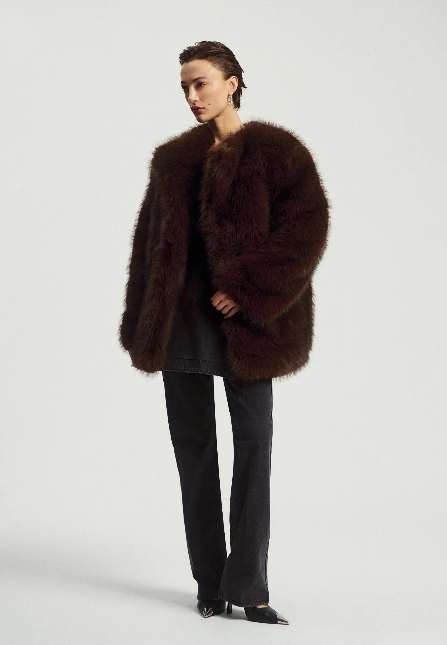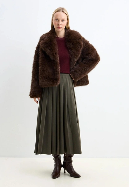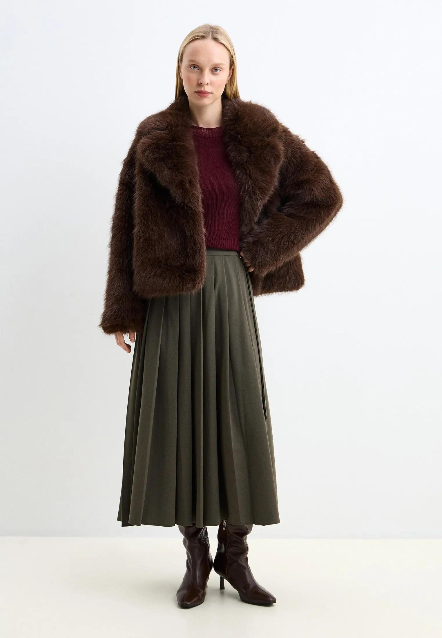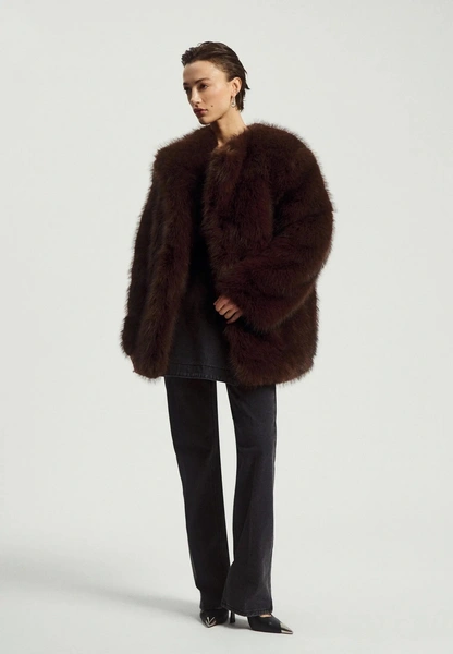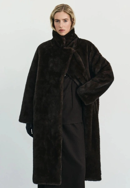 Длинная коричневая шуба с коротким плотным ворсом напоминает о культовых норковых шубах, которые когда-то носили наши мамы и бабушки. Сегодня такие модели делают из экомеха, а их силуэт стал строже и лаконичнее, формируя вытянутую вертикаль. Это отличный вариант, если хочется элегантности и винтажного настроения, но без ощущения «наследства из прошлого». С гладкими сапогами и длинным платьем такая шуба смотрится особенно эффектно.