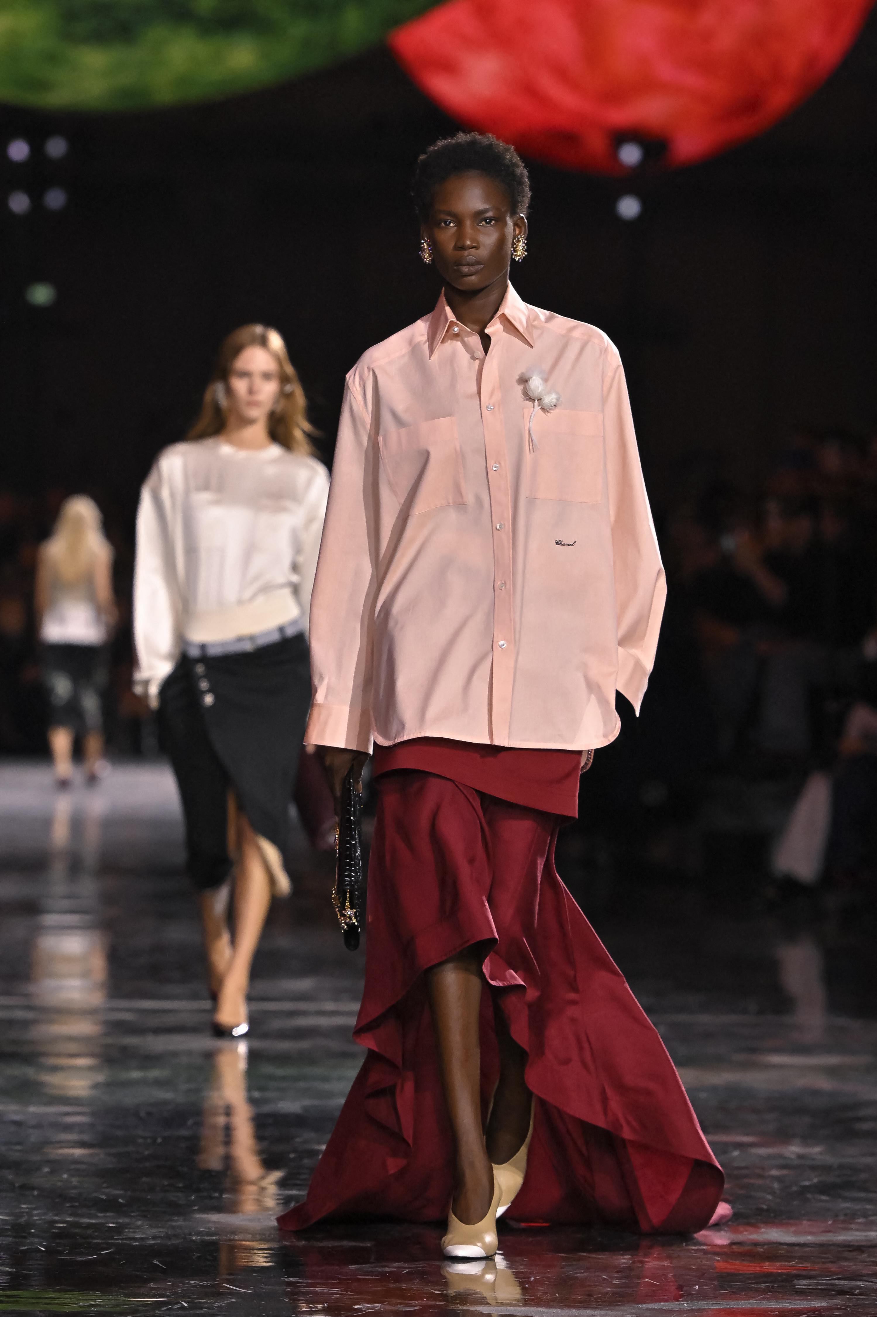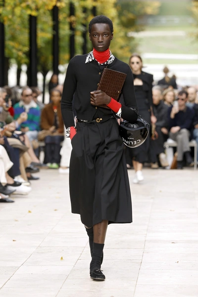Один яркий элемент способен полностью изменить образ. Красная водолазка в сочетании с черным кардиганом и черной юбкой-миди — простой, но эффектный прием, который можно увидеть у Celine. Главное здесь — яркое горлышко и рукава, которые сразу приковывают взгляд. При желании можно добавить еще один контрастный оттенок: белый принт, светлую сумку или туфли.