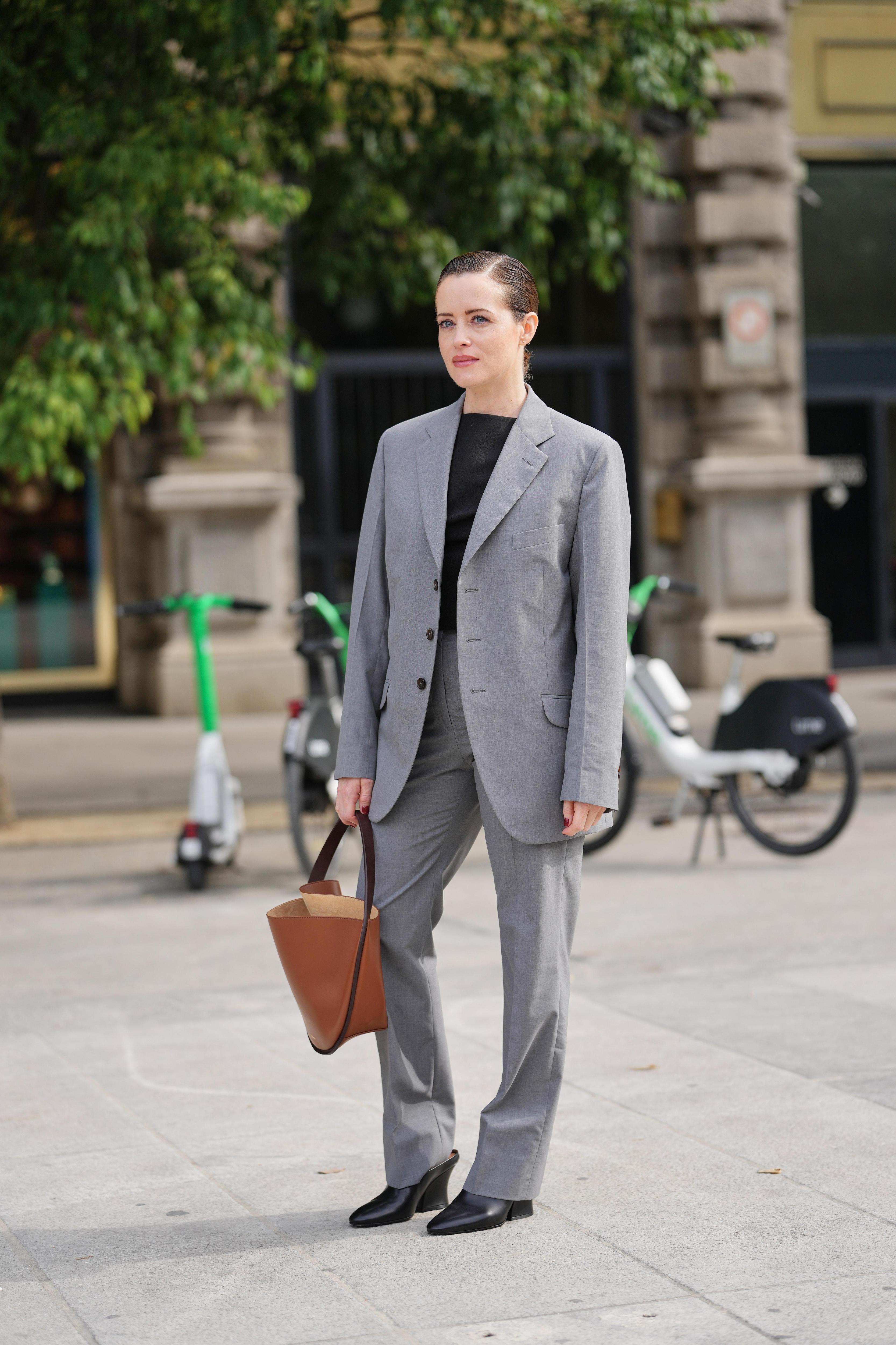 Классика, без которой невозможно представить Милан. В этом сезоне на улицах особенно выделялись костюмы свободного кроя в нейтральных тонах — серых, графитовых, светло-бежевых. Но главное — как их носили: с минимальными аксессуарами, строгой прической, четкими линиями. Простота здесь работает громче любых украшений.