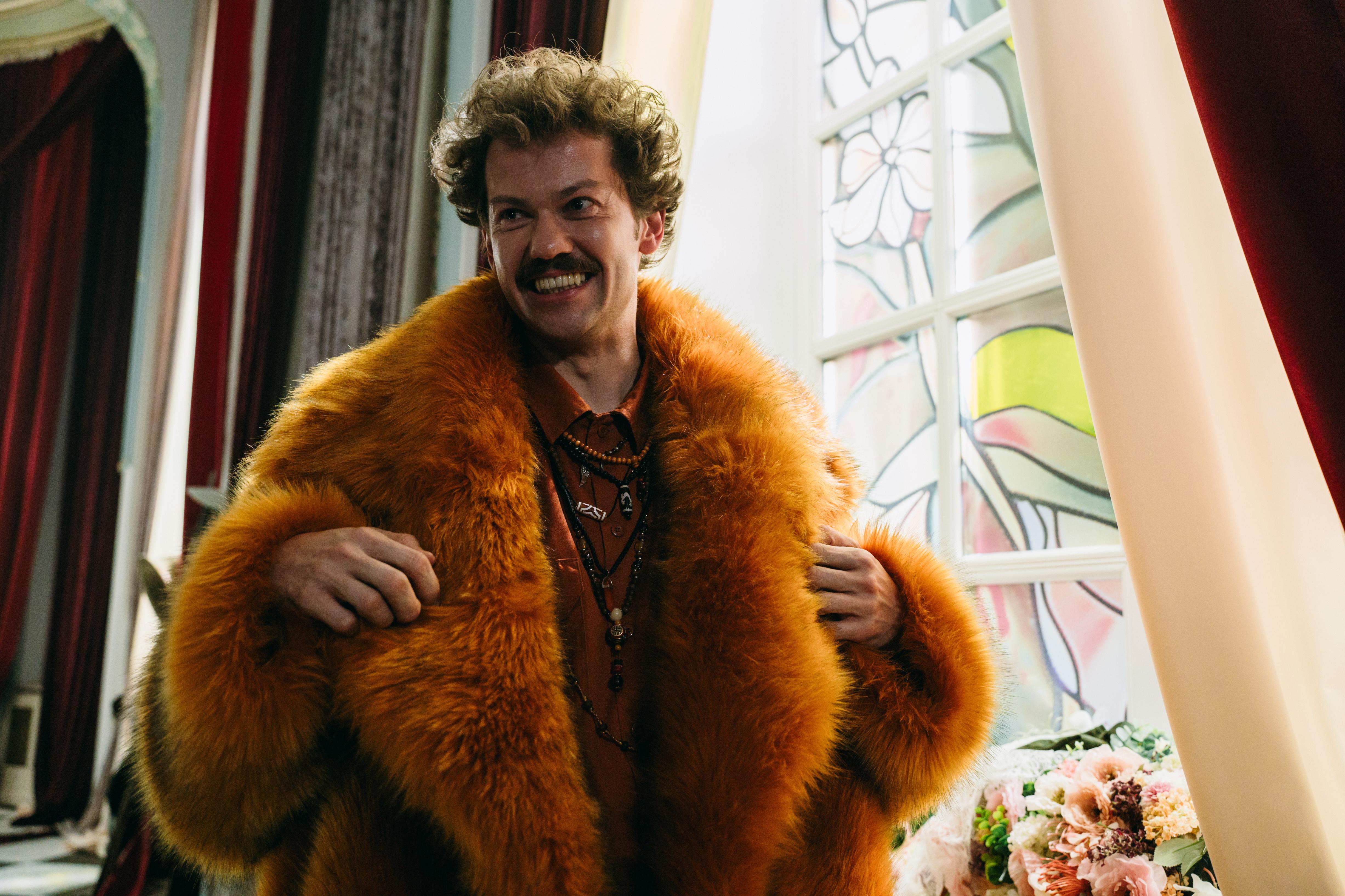 Главная деталь его гардероба — бархатный сюртук глубокого изумрудного оттенка. Насыщенный цвет и богатая фактура ткани придают образу театральности и благородства.