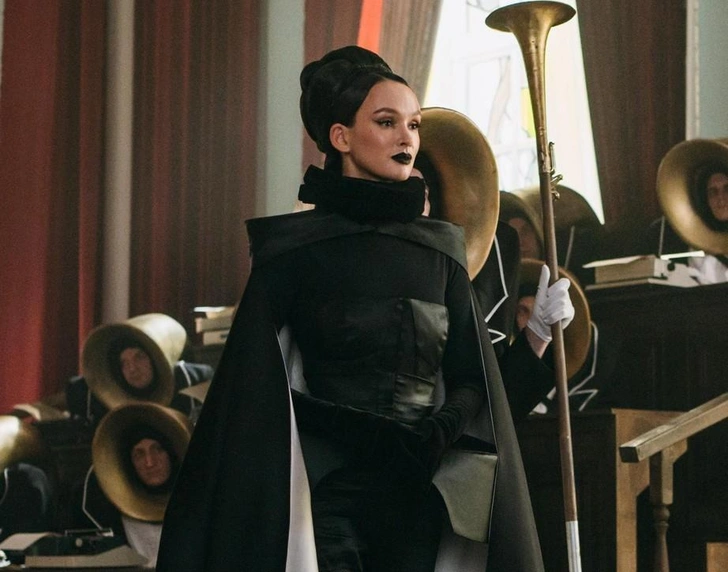 Для выходов в свет она выбирает эффектный тотал-блэк: брюки с выразительным клешем от колена, корсет с пышной баской и длинный плащ, драматично развевающийся за спиной. Этот ансамбль превращает Герцогиню в «модного диктатора», чья харизма завораживает и держит в напряжении.