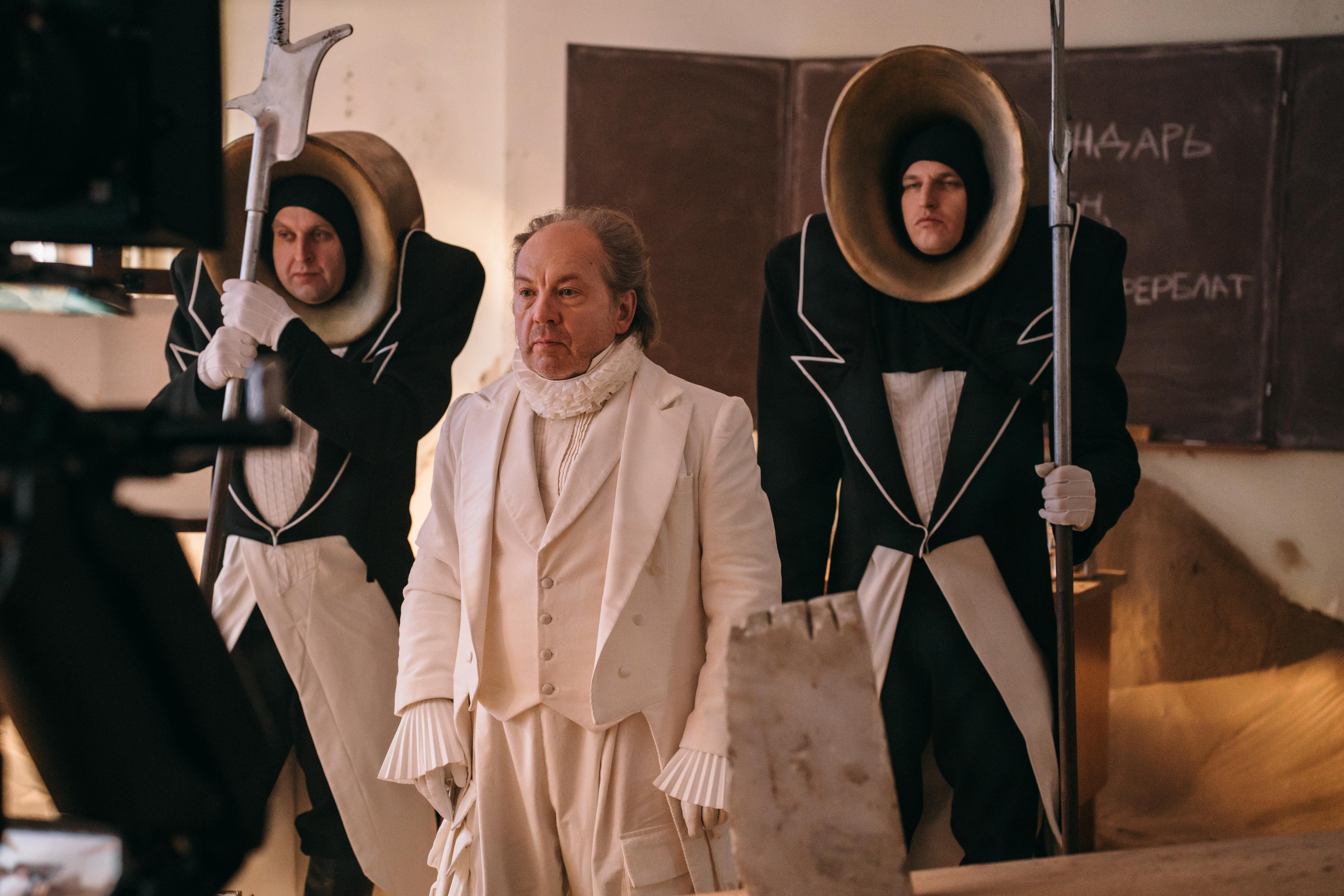 Вечно спешащий и одержимый временем, этот персонаж облачен в изысканный тотал-лук белого цвета, но не простой, а многослойный и нарочито выверенный. Здесь и строгий фрак, и элегантный жилет, и блуза с удлиненными рукавами и гофрированными расклешенными манжетами, а также пышный круглый воротник, отсылающий к историческим костюмам.