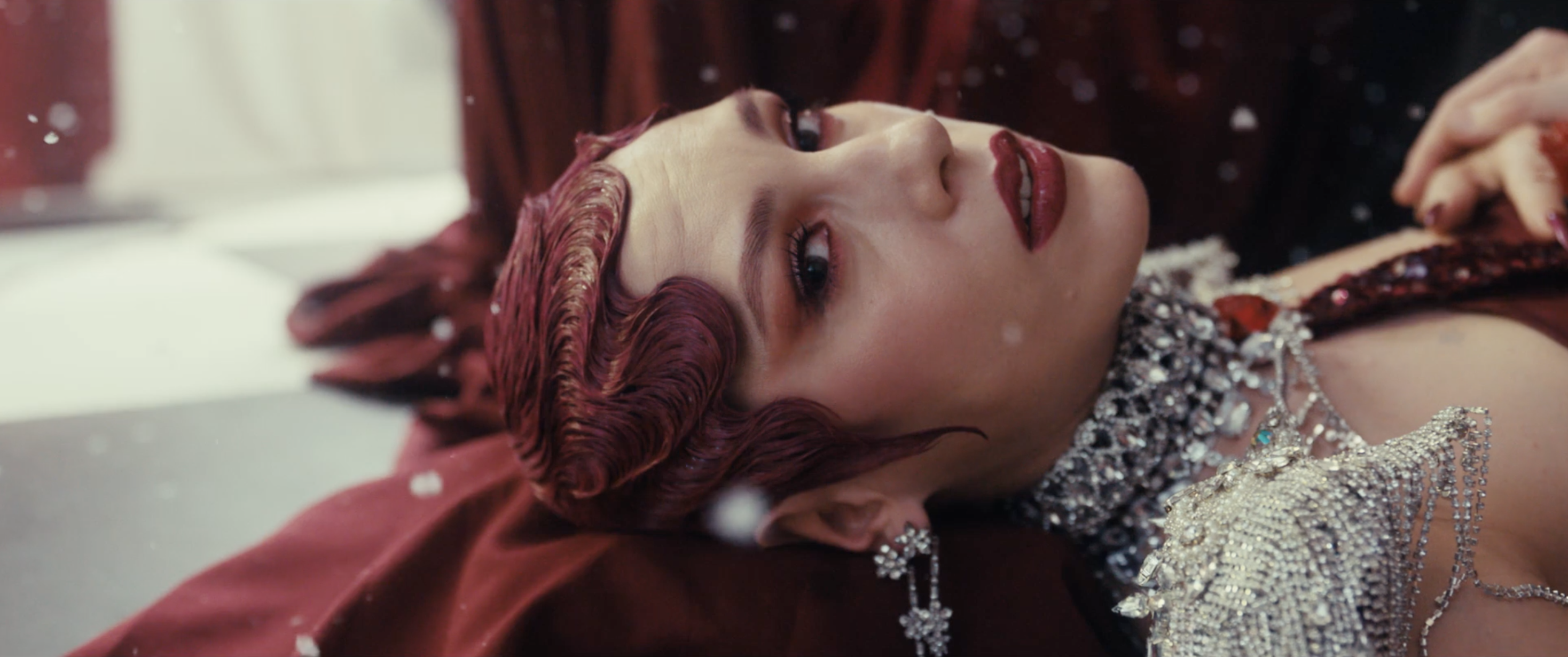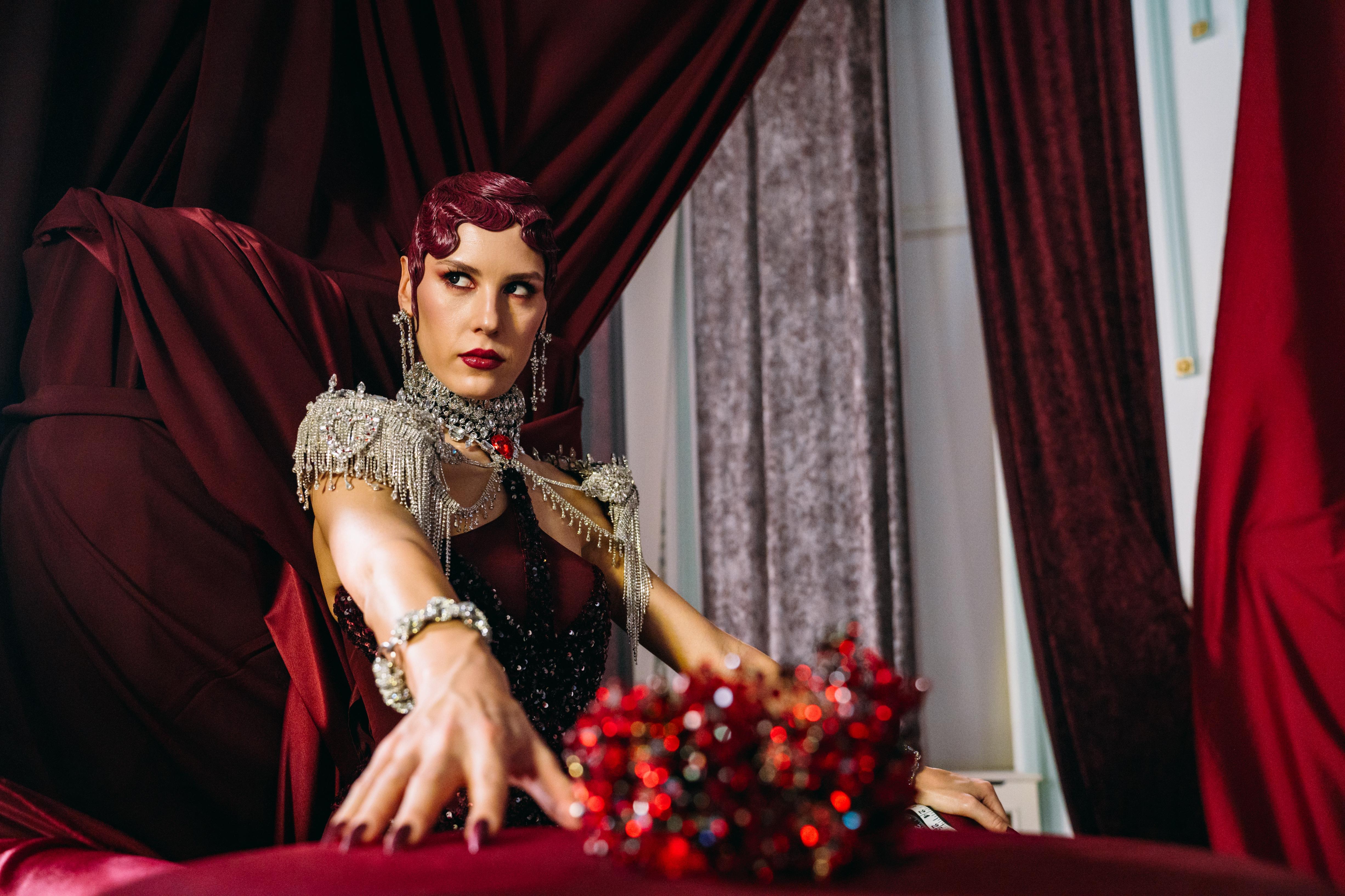 Бьюти-образ Королевы гармонично дополняет настроение платья. Макияж выдержан в единой палитре: насыщенные вишневые тени мягко растушеваны к вискам, губы покрыты сочной алой помадой. Короткая стрижка уложена в ретро-волны с косым пробором и влажным эффектом, добавляя облику экстравагантности.