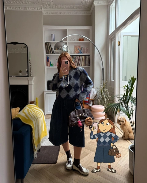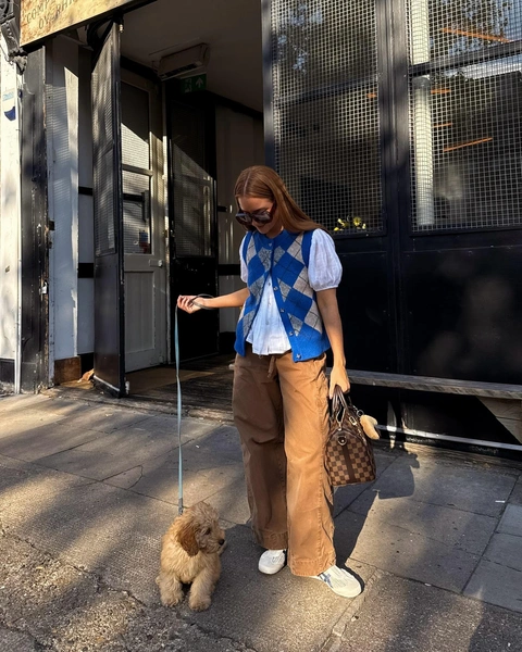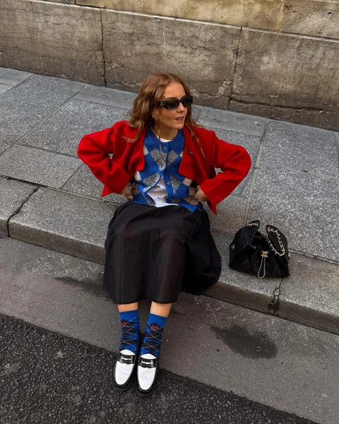Сегодня аргайл переживает очередной пик популярности — и не только в рамках преппи-эстетики. Он стал частью ярких подиумных образов и стритстайла: его носят с балетками, остроносыми туфлями, пуховиками, широкими брюками и даже шелковыми платьями.