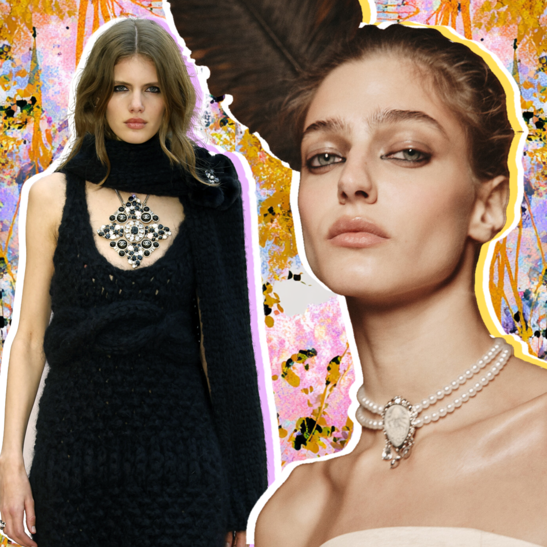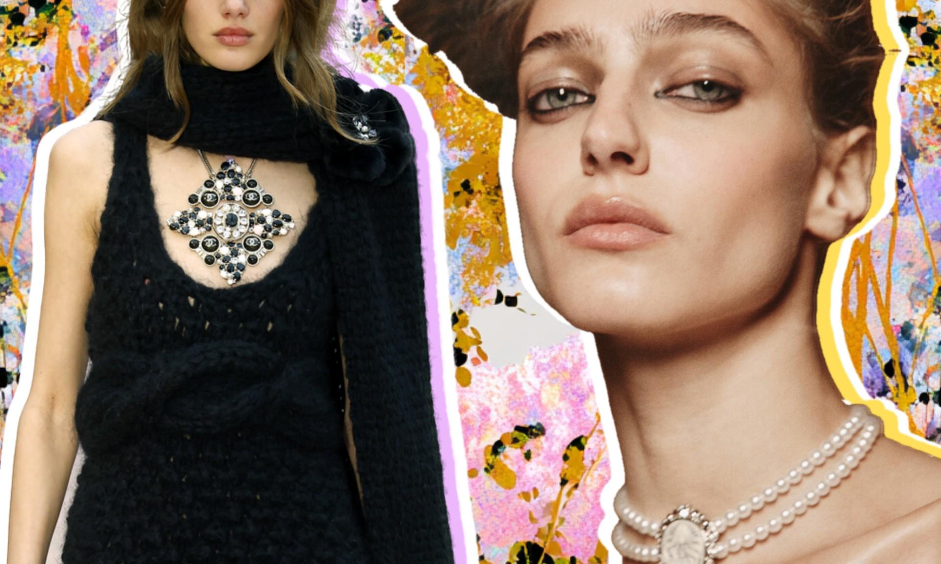 Если есть бренд, который умеет работать с историческими мотивами, то это Chanel. В новых коллекциях легко заметить ожерелья, собранные как сложные архитектурные композиции. Самый яркий пример — треугольное панно, усыпанное черными и светлыми камнями. В центре — аккуратная композиция в технике «хало»: крупный камень окружен мелкими, образующими сияющий ореол.