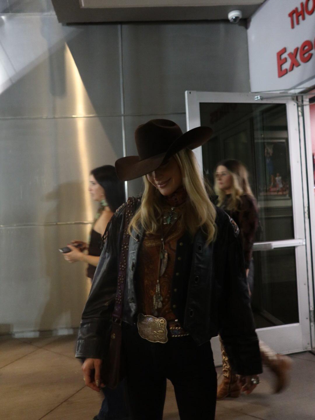 Мы давно не видели Хадид в настолько цельном ковбойском образе, но для этого события она буквально вернулась в седло — и визуально, и по настроению. В основе лука — винтажный топ с узором пейсли, отсылающий к классике американского Запада. Сверху — куртка из темно-коричневой состаренной кожи с длинной бахромой, которая красиво двигается при каждом шаге. Но и этого оказалось недостаточно: под куртку Белла надела кожаный жилет без рукавов, с вырезом в форме сердца на спине — деталь, которая добавила образу иронии и личного шарма.