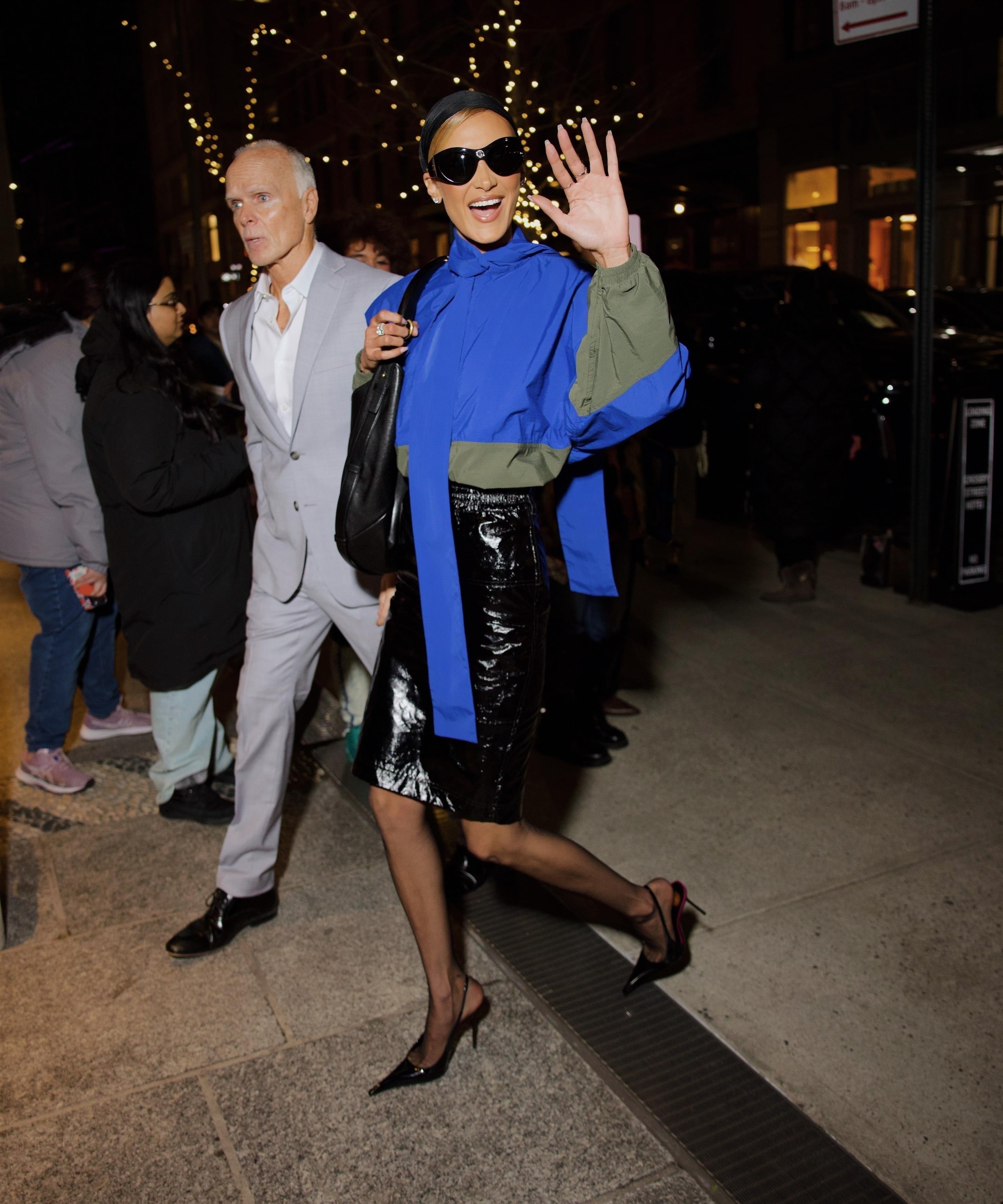 Белла подошла к вопросу без лишних усложнений. Ее образ был собран вокруг комплекта Saint Laurent авторства Энтони Ваккарелло из коллекции Cruise 2026. Кобальтово-синяя блузка с воротником лавальер стала центральной точкой образа: мягкая ткань красиво ложилась по фигуре, а сам оттенок сразу притягивал взгляд. В пару к ней Хадид выбрала юбку-карандаш из лаковой кожи черного цвета — лаконичную, строгую, без декоративных отвлечений. Туфли-лодочки с острым мысом поддержали вытянутую линию силуэта и добавили нужной собранности.