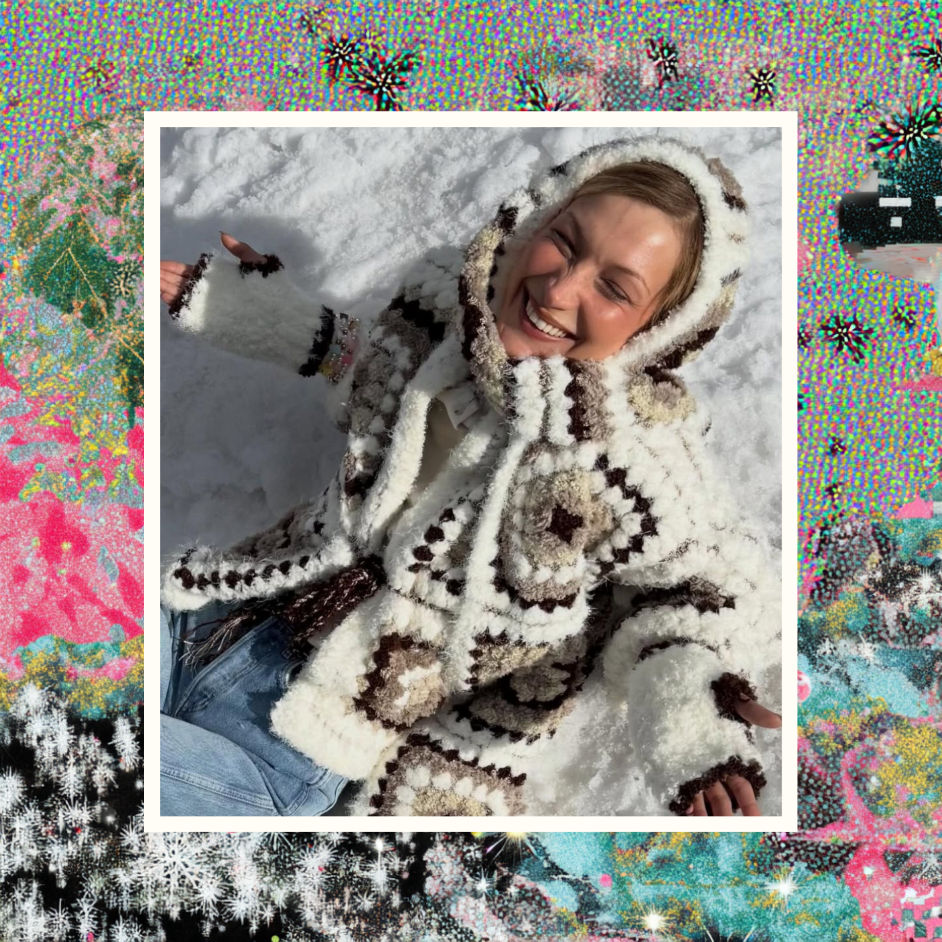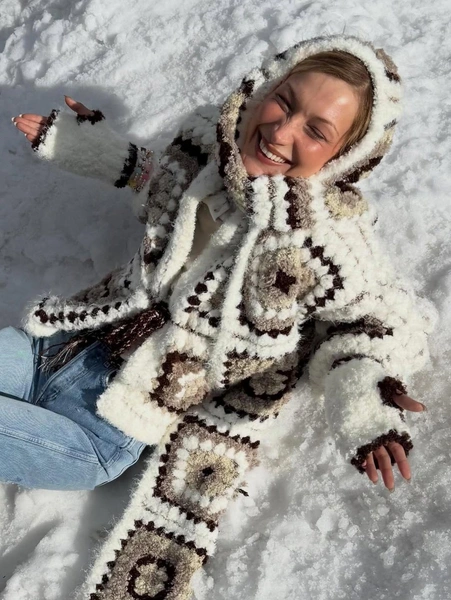 Модель, известная своим умением чувствовать и формировать модные настроения, выбрала для прогулки по заснеженному курорту объемный кардиган, связанный крючком в лоскутно стиле. Модель белого, бежевого и шоколадного цветов с графичными цветочными узорами сразу привлекла внимание. Хадид надела его поверх простой белой футболки и светлых джинсов с потертостями, создав контраст между фактурной, почти рустикальной верхней частью и гладким низом. Этот прием — ключ к современному прочтению тренда: ажурная, пушистая вещь не выглядит старомодной или слишком богемной, когда ее уравновешивают простые базовые предметы.