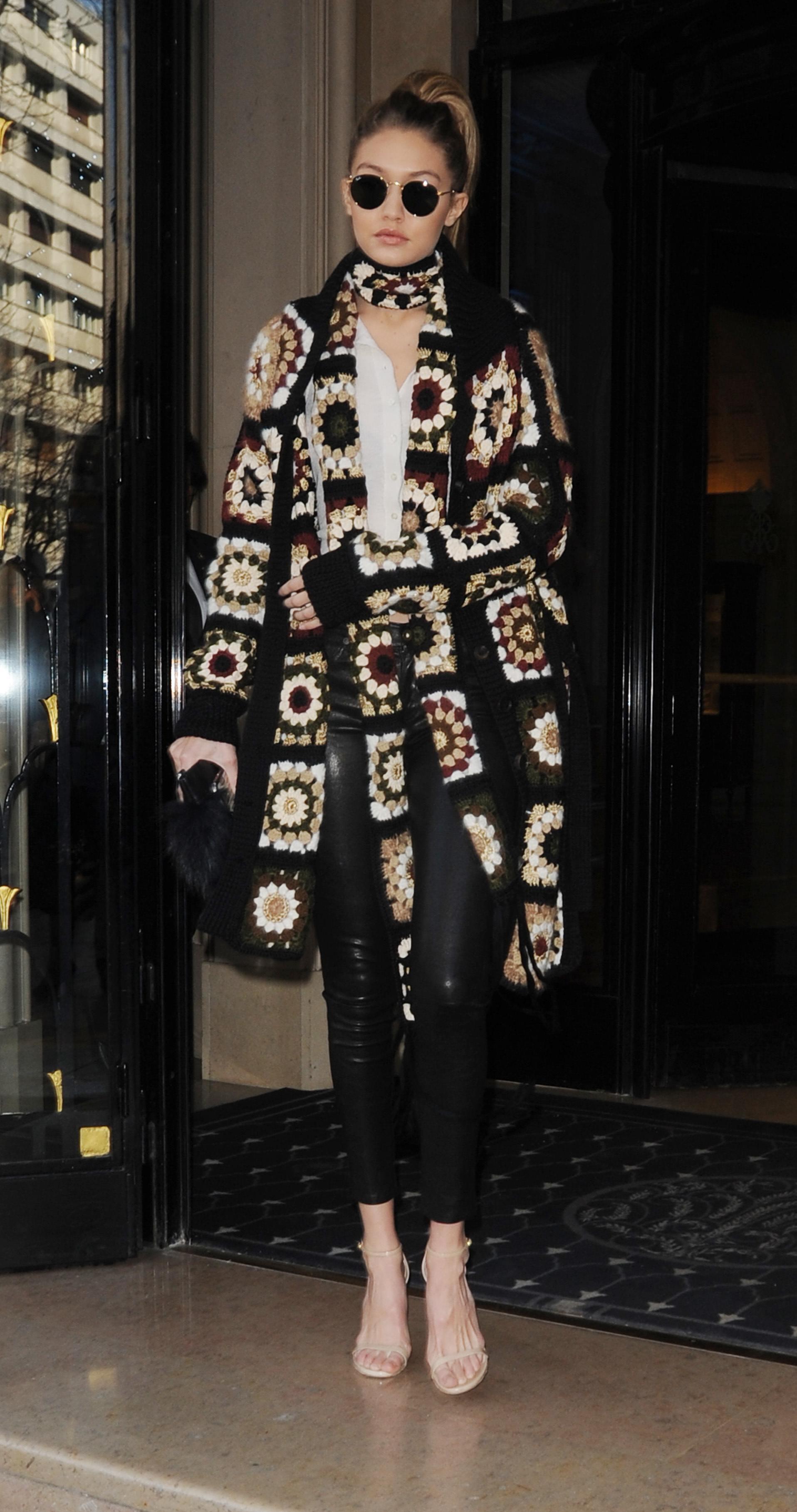 Интересно, что подобный силуэт в гардеробе Хадид — не новинка. Почти десять лет назад, в январе 2016, сестра Беллы, Джиджи, гуляла по парижскому левому берегу в похожем ансамбле: джинсы, футболка и длинный кардиган, связанный крючком в том же лоскутном стиле, с шарфом в тон. История повторяется, но с важными нюансами. Если тогда образ был выдержан в более темных, приглушенных тонах и воспринимался как часть общей богемной волны, то сегодня Белла делает акцент на светлой гамме и графичном узоре. Это говорит о новом витке — тренд стал более изящным, светлым и точно встроенным в современный контекст.
